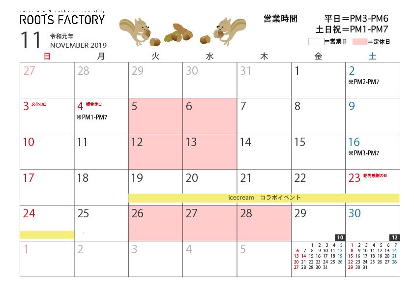 さて、ROOTS FACTORY東京店シモキタベースの11月営業日についてのお知らせです!