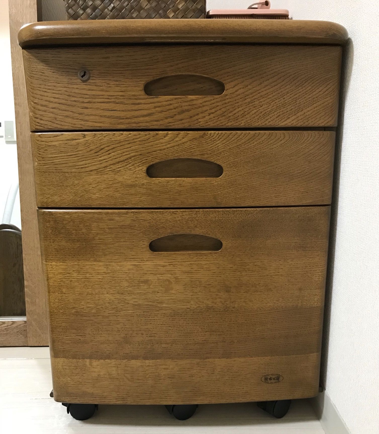 浜本工芸さんのデスクで、デスク天板もインワゴンの天板や引き出しも、全て無垢ナラ材でできたとてもしっかりしたものでした。