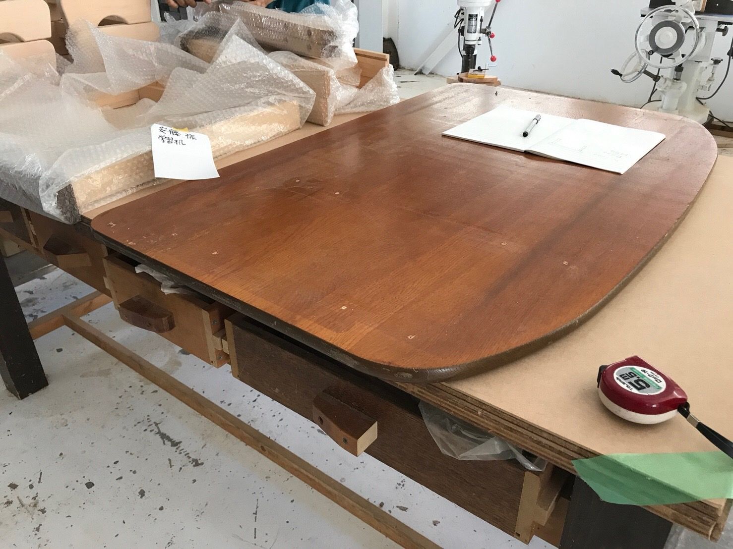 お客様のご希望は、ダイニングテーブルとして使えるようにしたいとのこと。サイズは、元の天板から取れる範囲内で良いとのことでした。