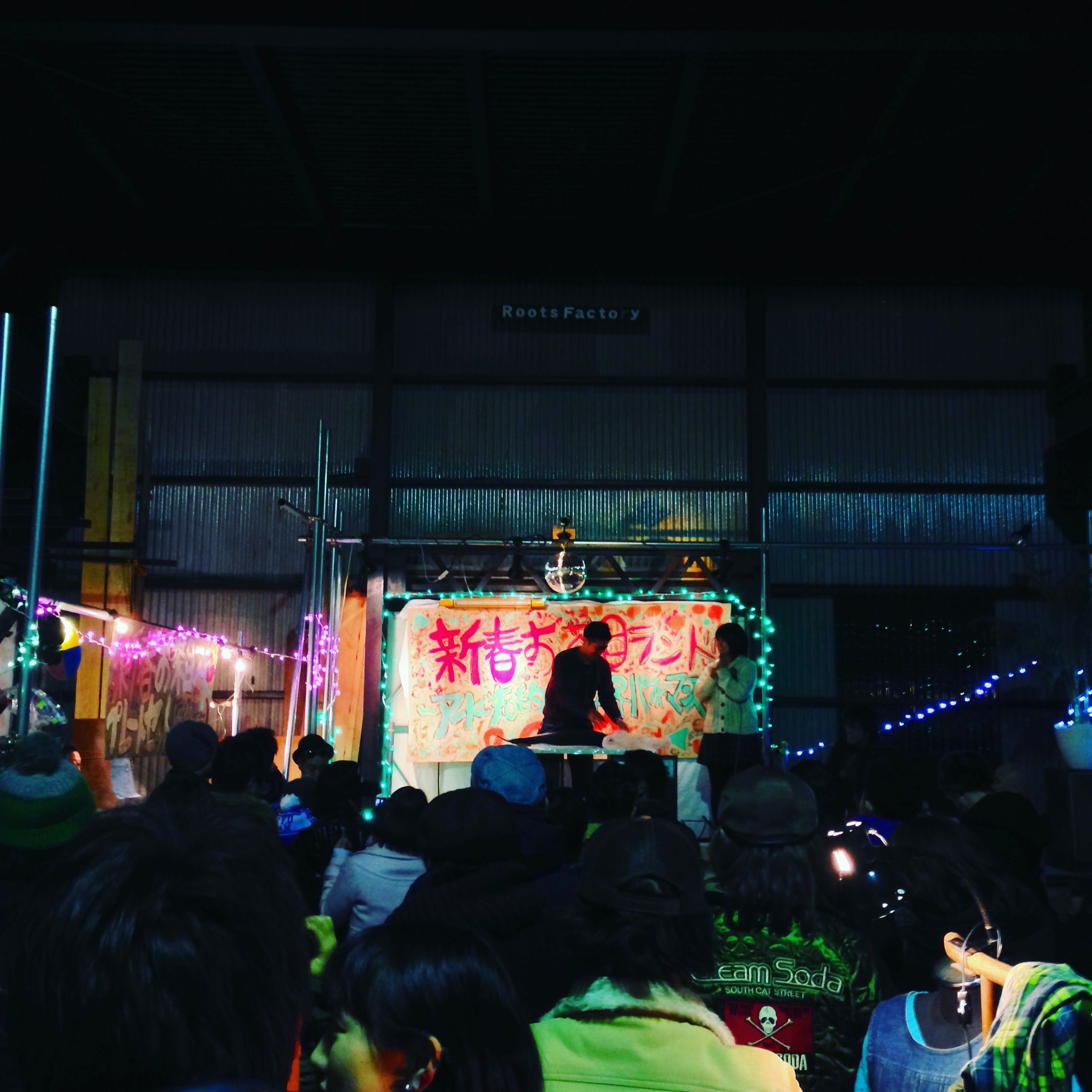 大きなステージを組んで紙芝居にライブにダンスパフォーマンスに寒ブリの解体ショーまで、なんでもありのハチャメチャな新年会、