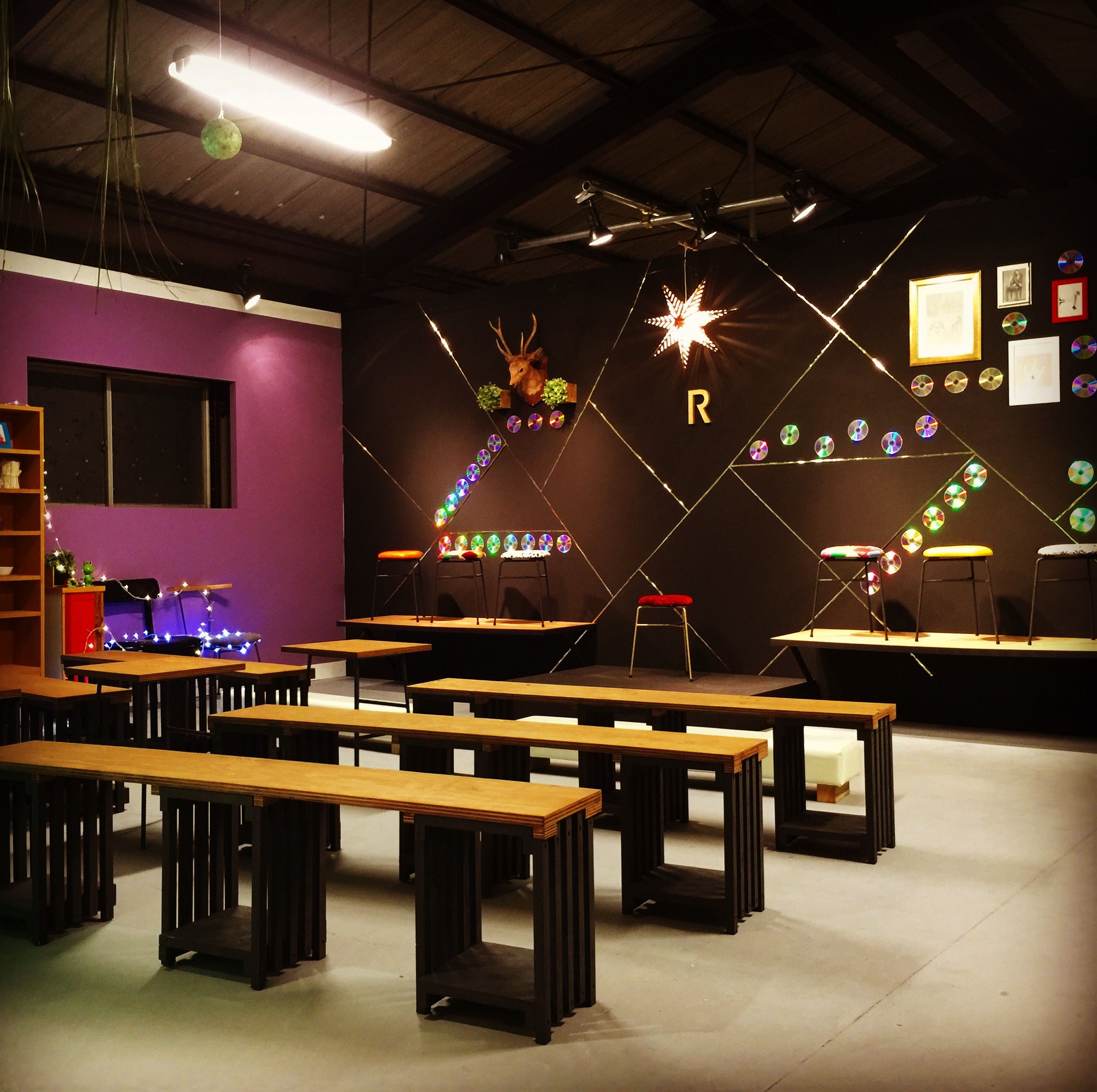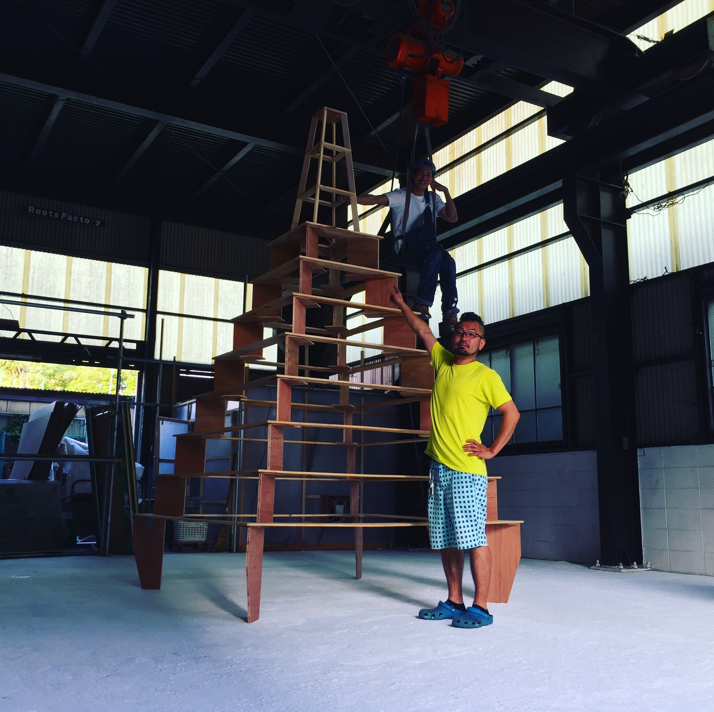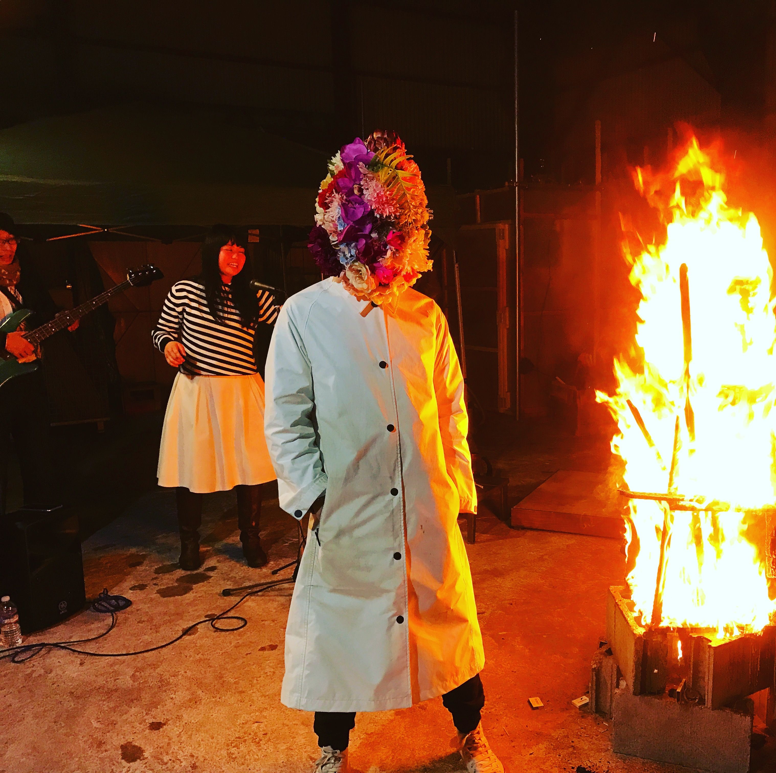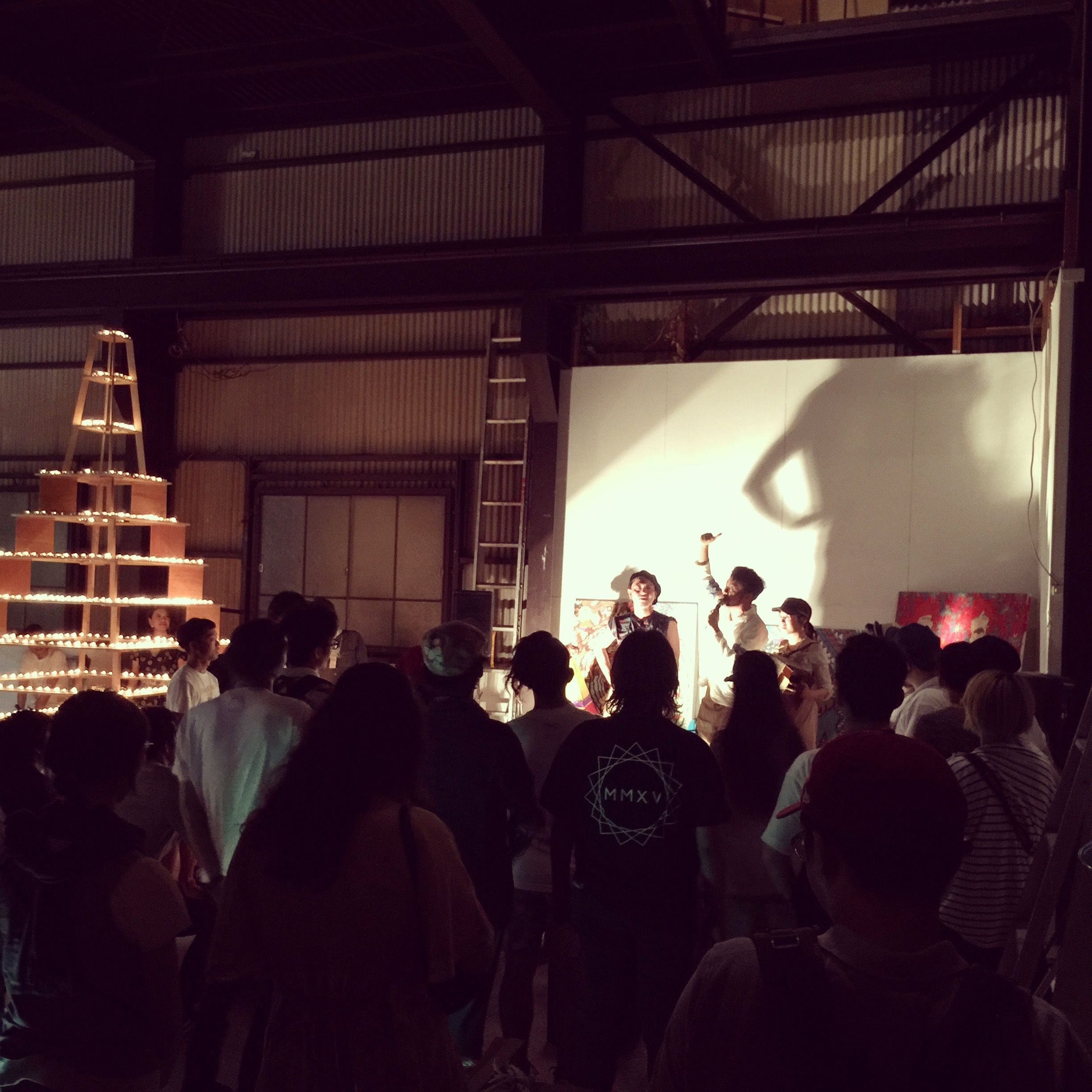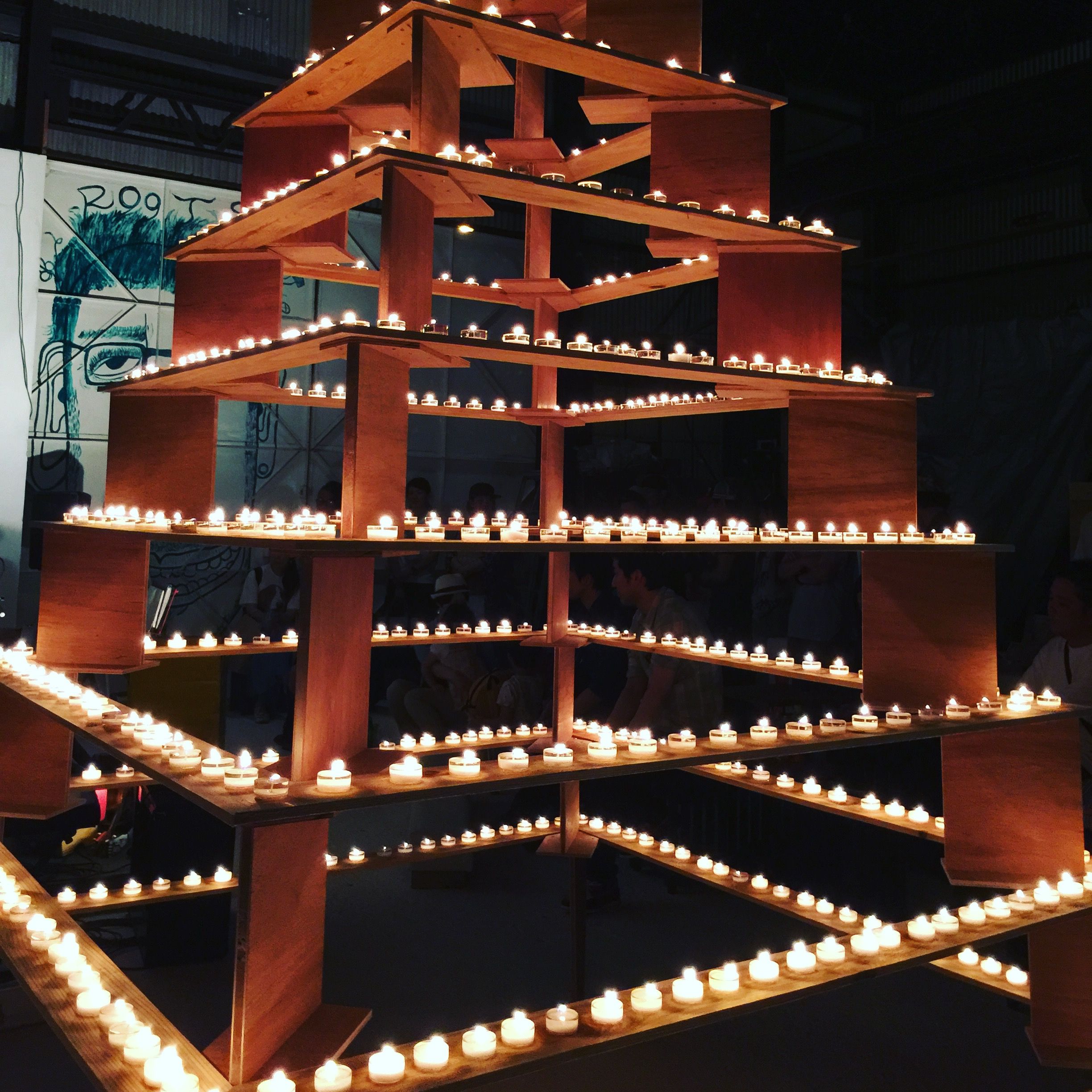 最後にやったのは東京からミュージシャンや画家のみなさんをお呼びしてのライブイベント、キャンプをテーマにデコレーション、3階はアートギャラリーに。1階ではキャンプファイヤーの代わりに4m近いキャンドルタワーをつくってキャンドルパーティーもしました。