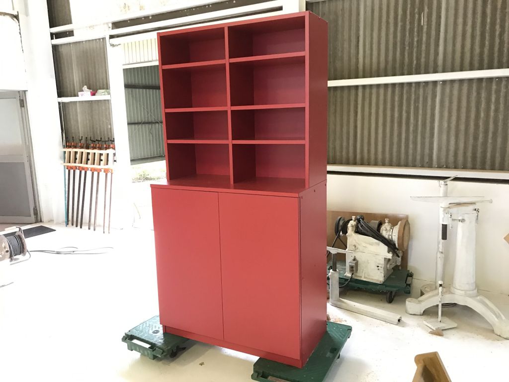 真っ赤なブックシェルフ(扉付き)をオーダーメイドでつくったり!