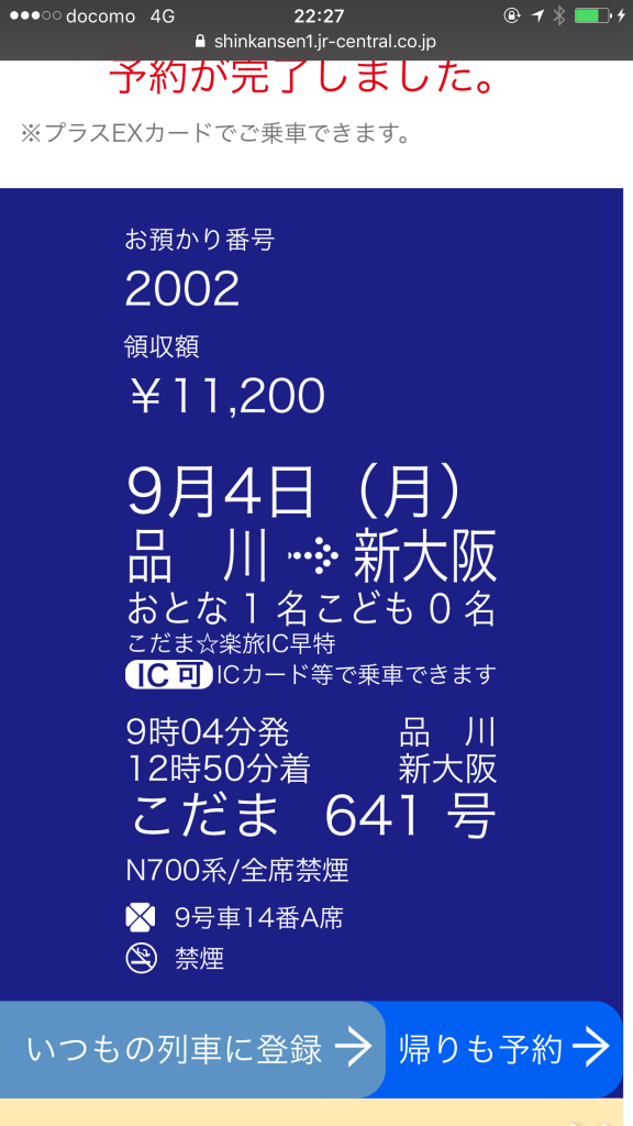 前からカード作って登録(プラスEXから)はしてたんやけど、3日前から予約ってのがなかなか出来なくて初めて使った。