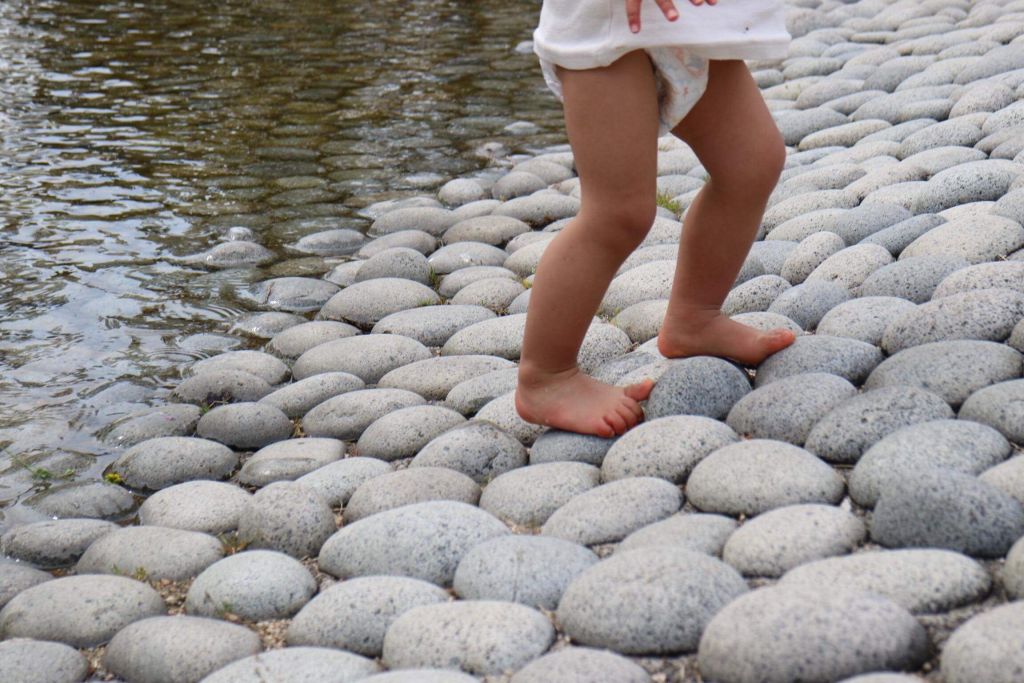 丸石で凸凹な地面を、小さな素足で慎重に。たまによろけながらも、助けを求めるでもなくズンズン進んでゆくムスコの姿に、たくましさを感じました。