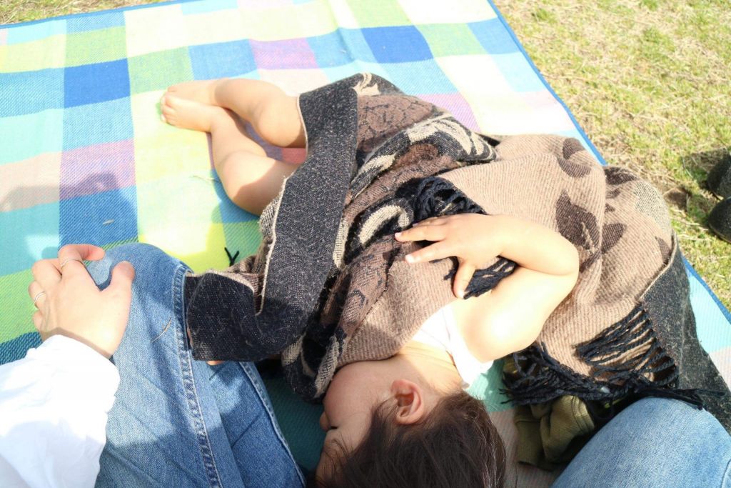 シートに戻ってきたムスコは、ちょっと体が冷えたのか、パンツ姿のままゴロンして、ストールをかぶってもぞもぞ…