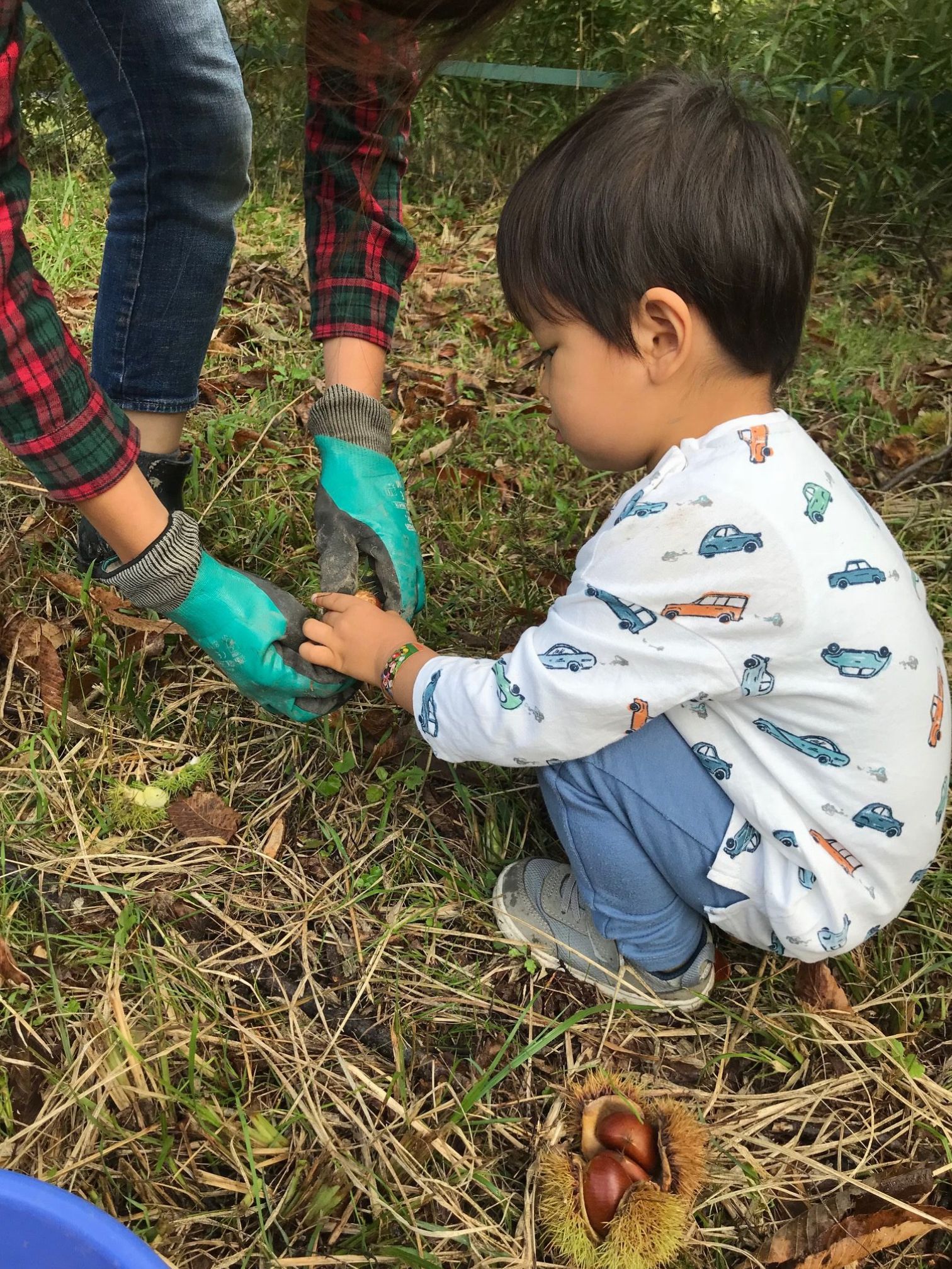 トゲが危ないので、私が厚手の軍手をはめて実が簡単に取れるように開いてあげて、それをムスコの小さな手で取っていってくれます。