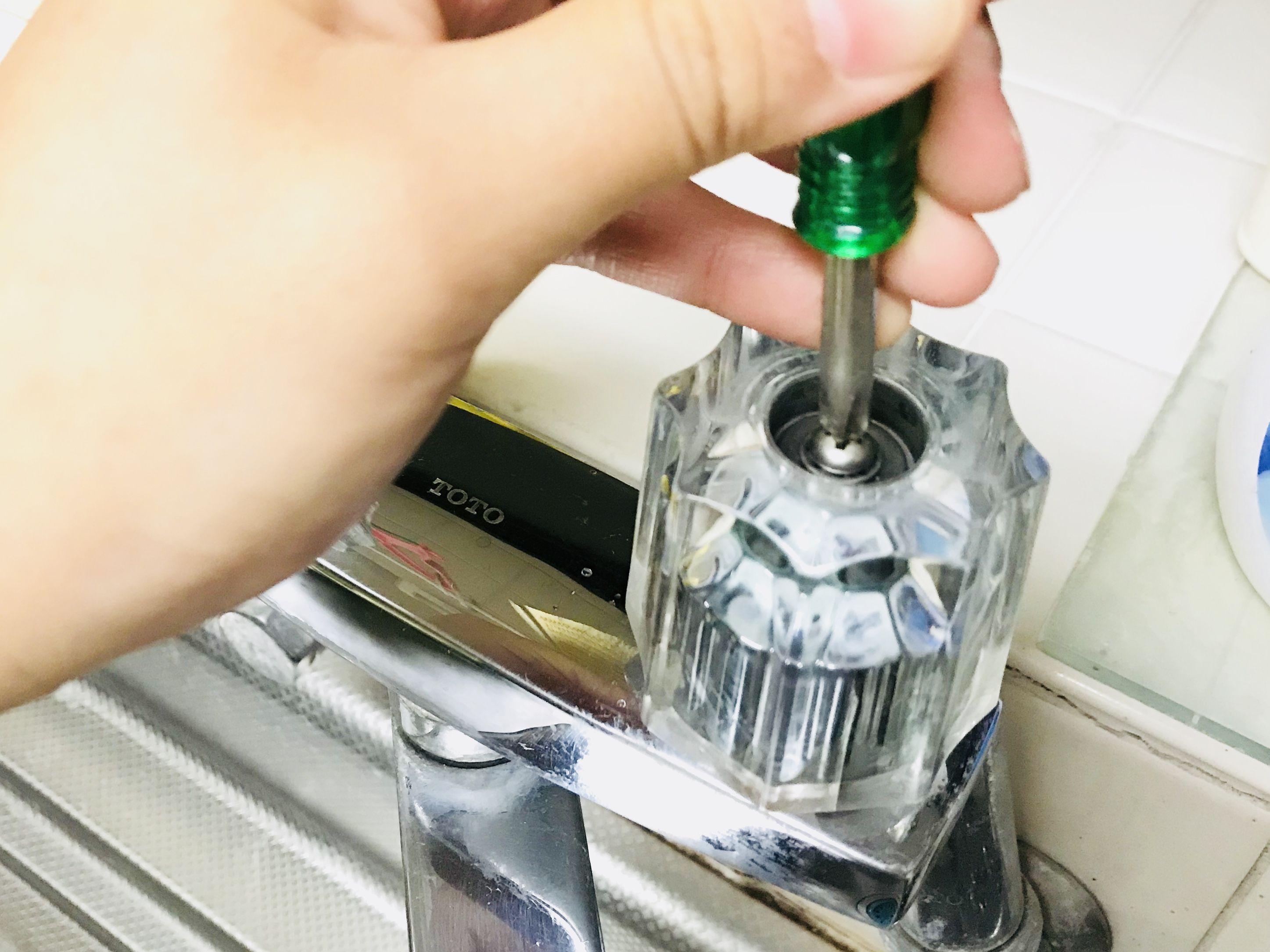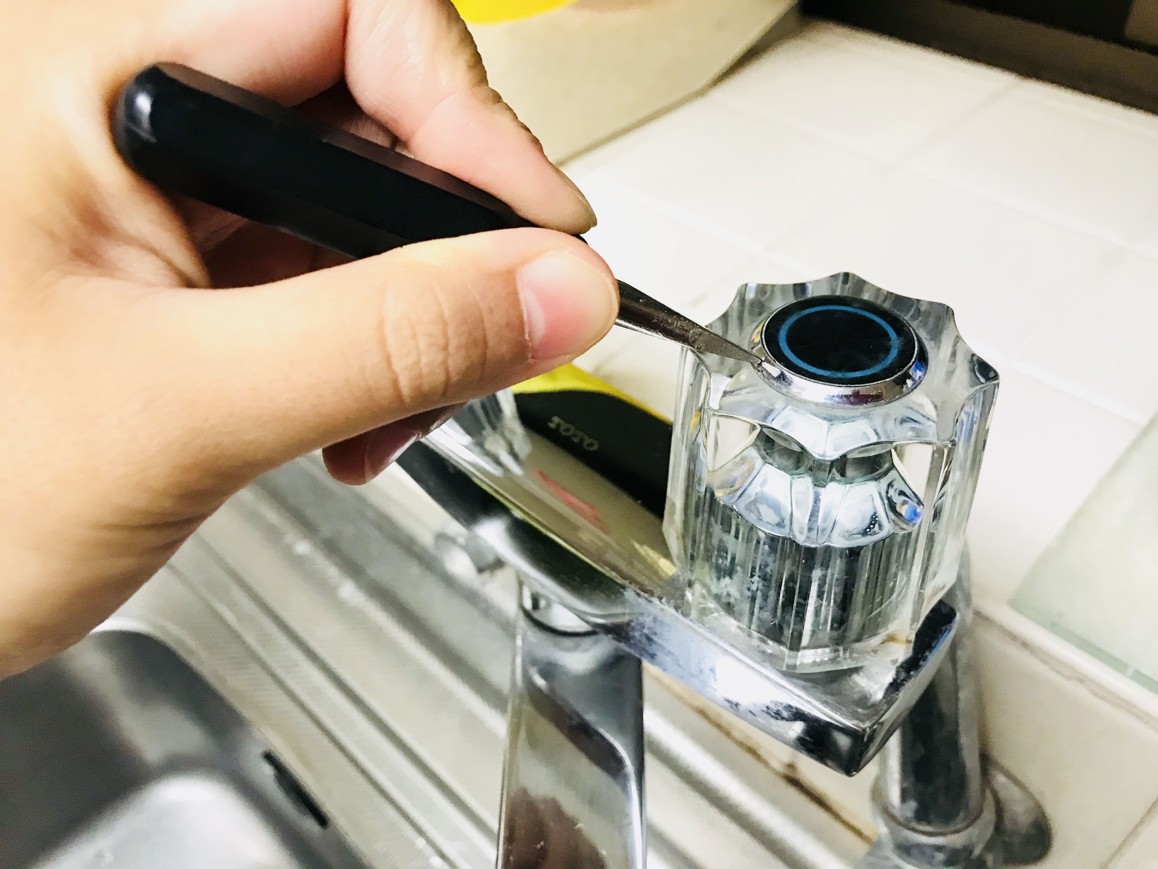 水道の元栓を閉めてから、まずはハンドルのキャップ部分をマイナスドライバで持ち上げ
