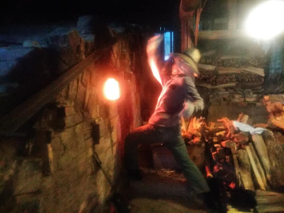 その時、この窯の中が真っ赤に燃え上がる状態になるよう、丸一日中、小窓から薪をくべて炎を燃やし続けるのですが、