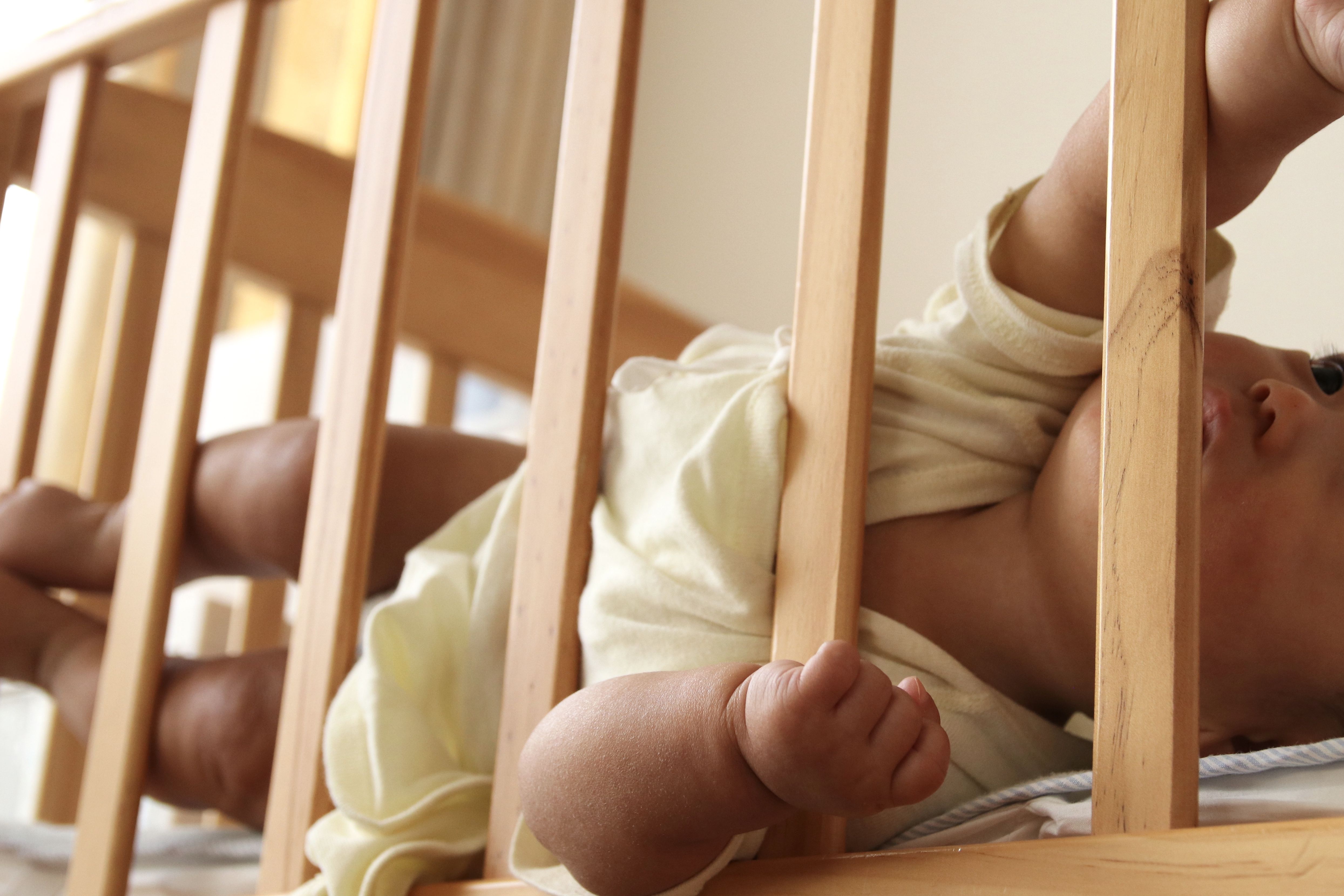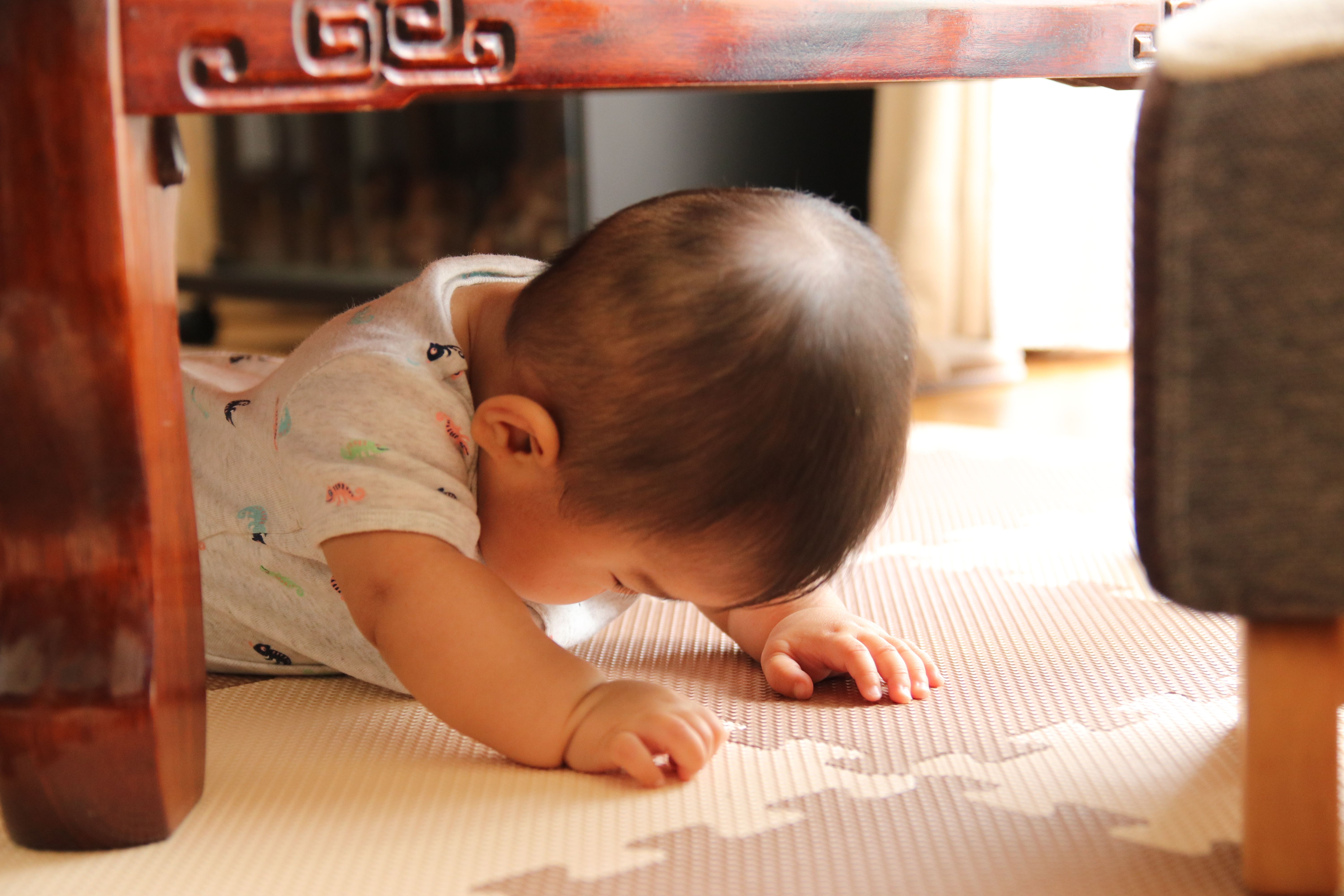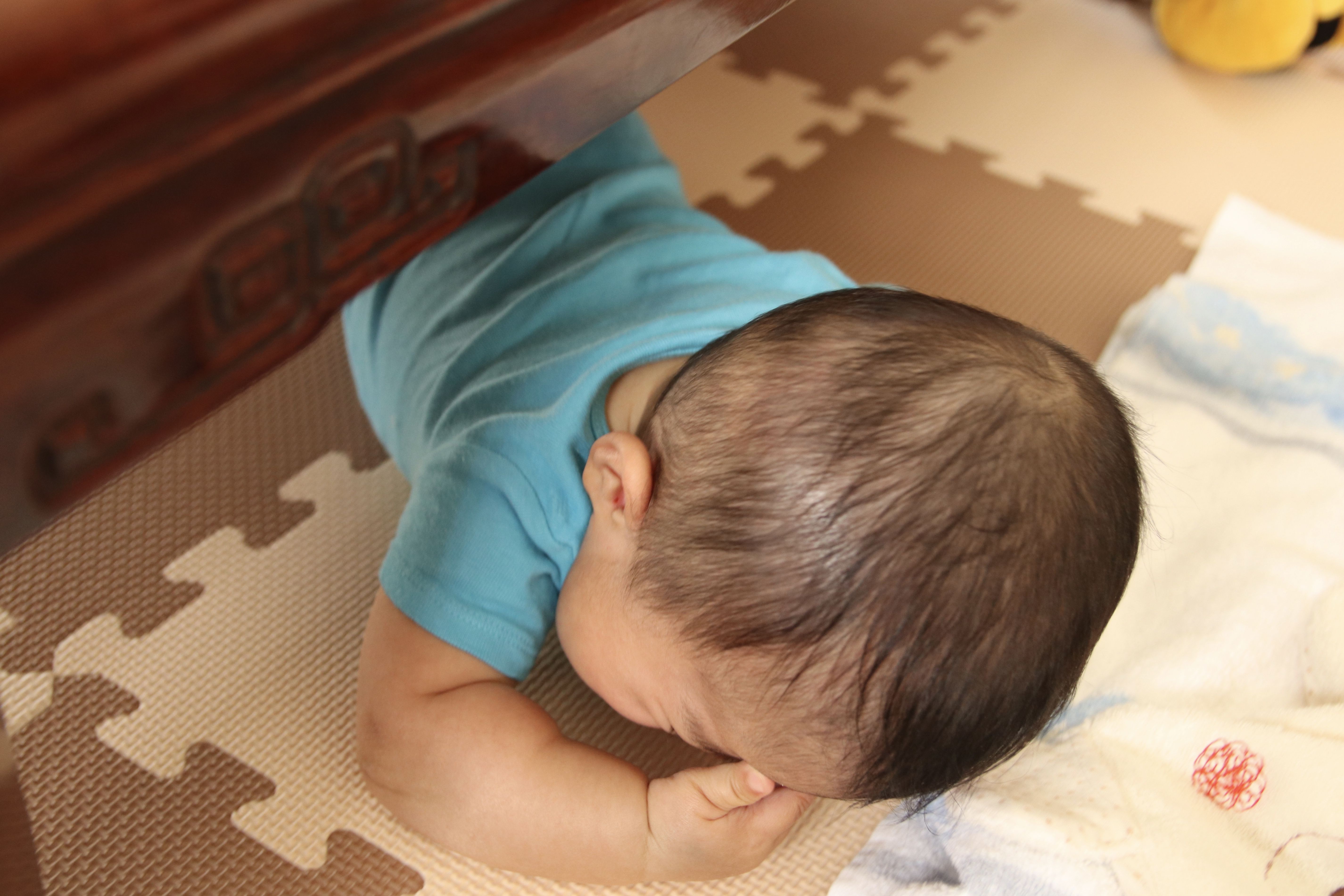 (6月1日。後ろ向きにはいはいできるようになった息子。自ら座卓の下に潜り込んで頭をぶつける。)