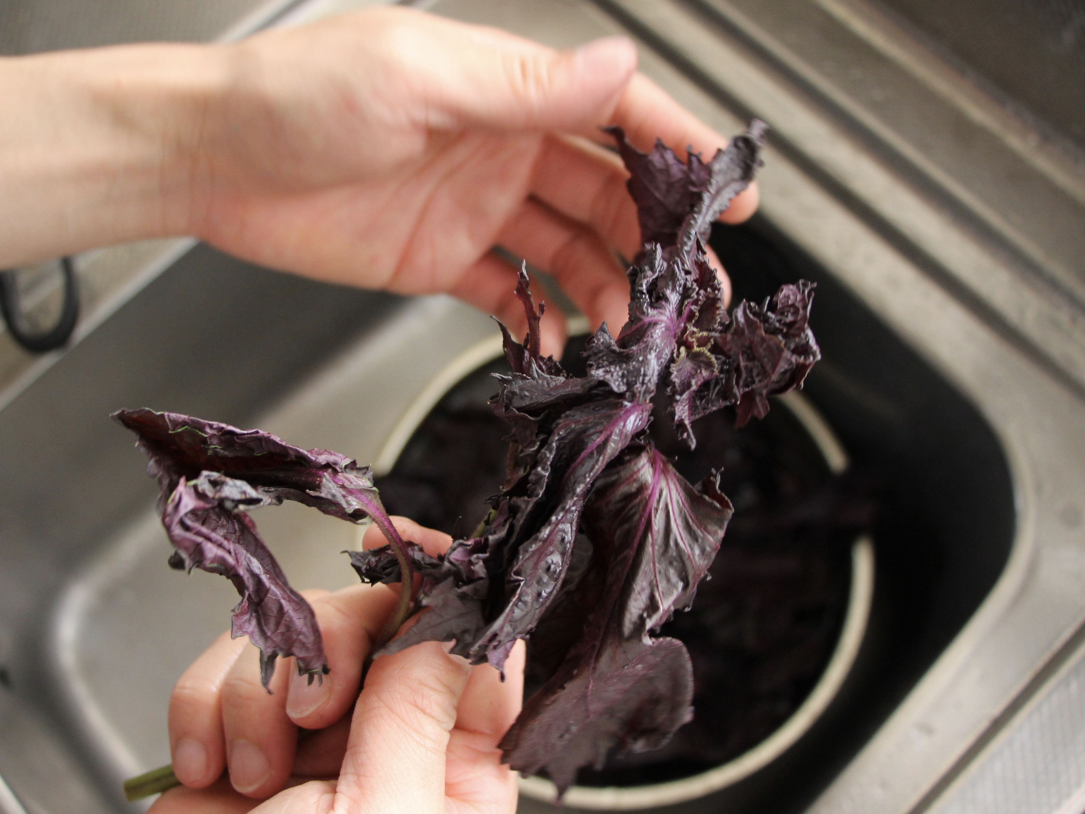 まずは、赤シソの茎を摘み取って葉っぱを選り分けていきます。