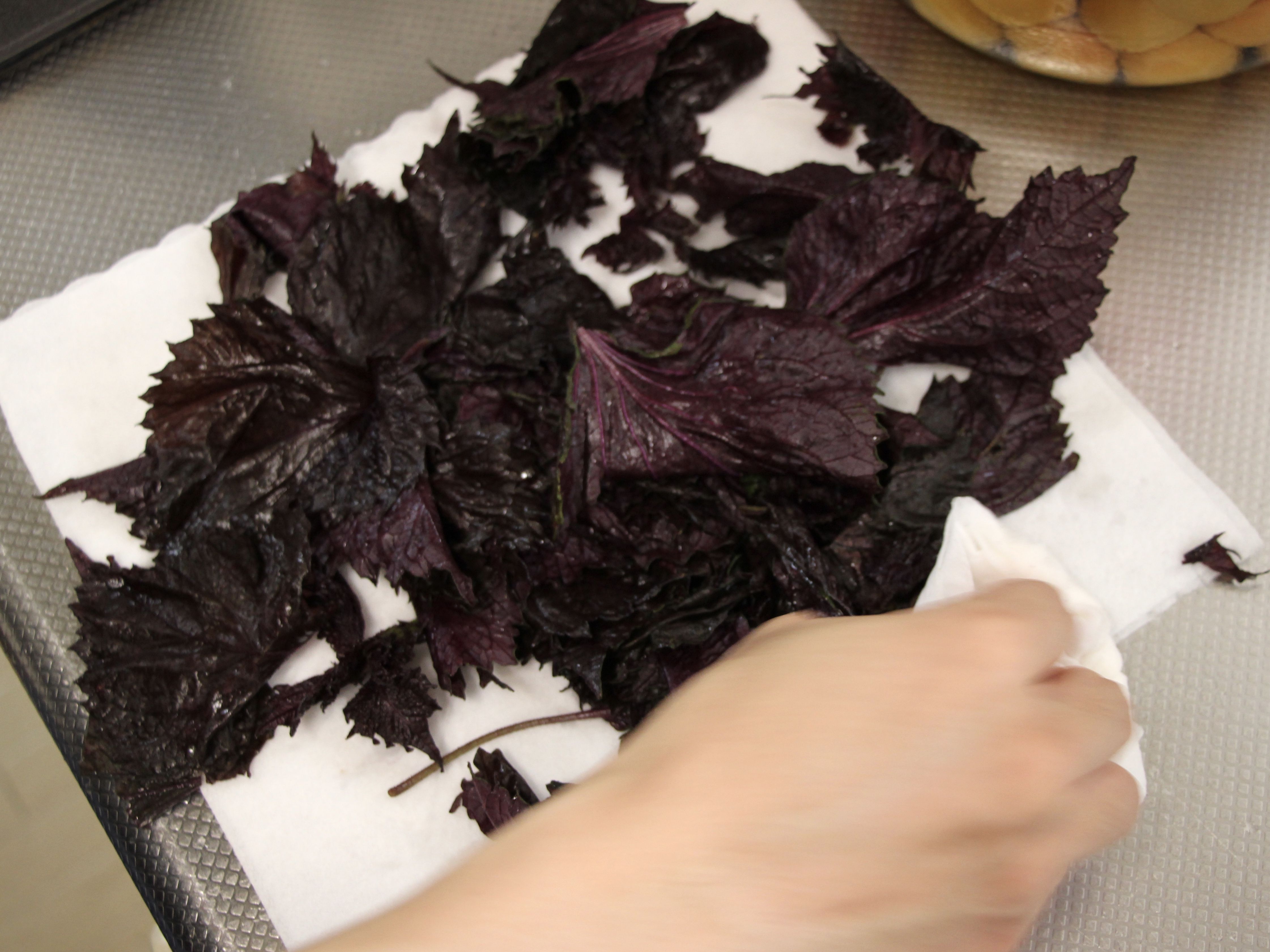 さて、気を取り直して、シソを水から引き上げたら、キッチンペーパーでしっかりと水分を拭き取ります。