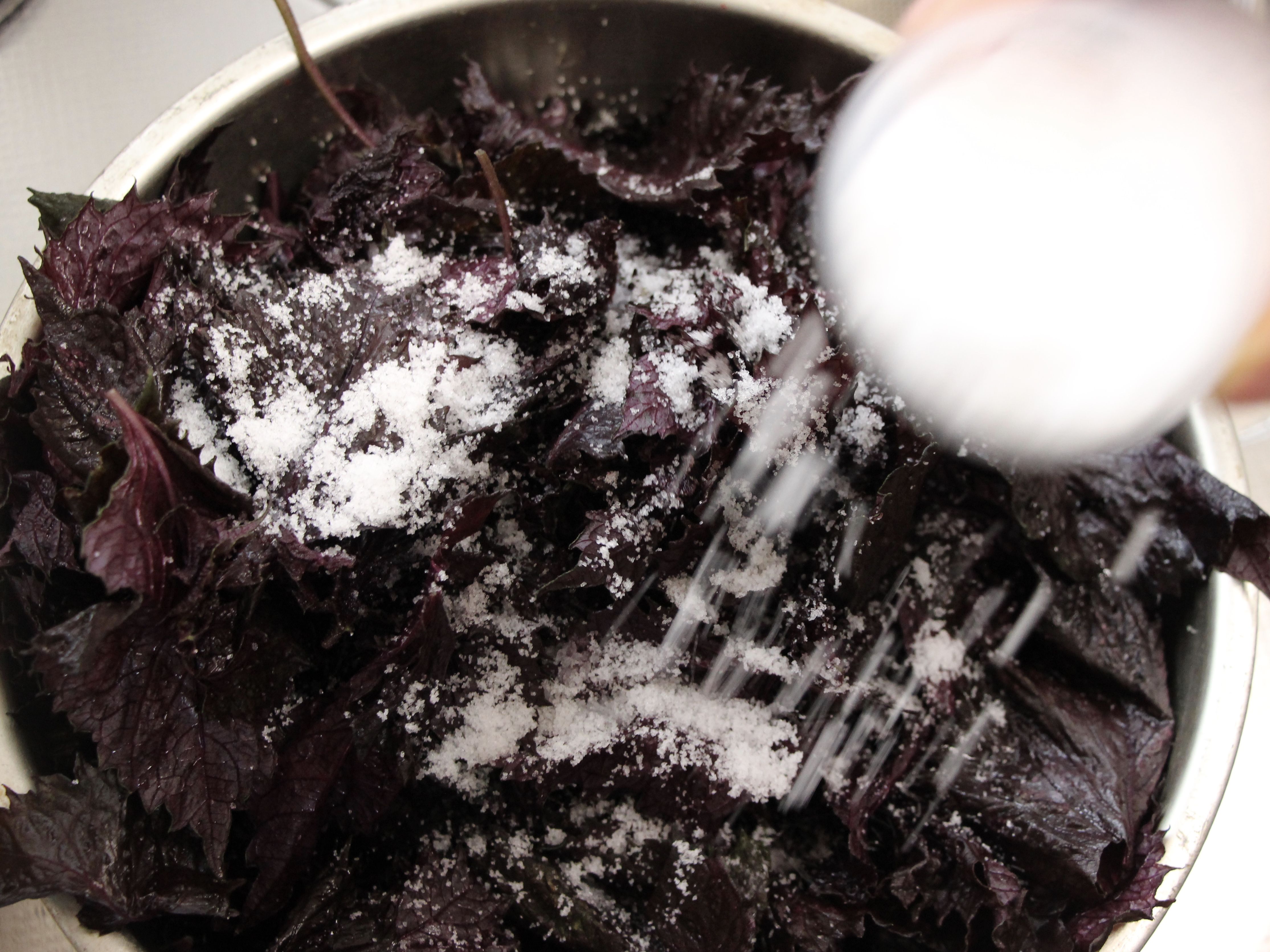 塩を3/4カップ程度用意して、まずはその2/3を赤シソに投入します。