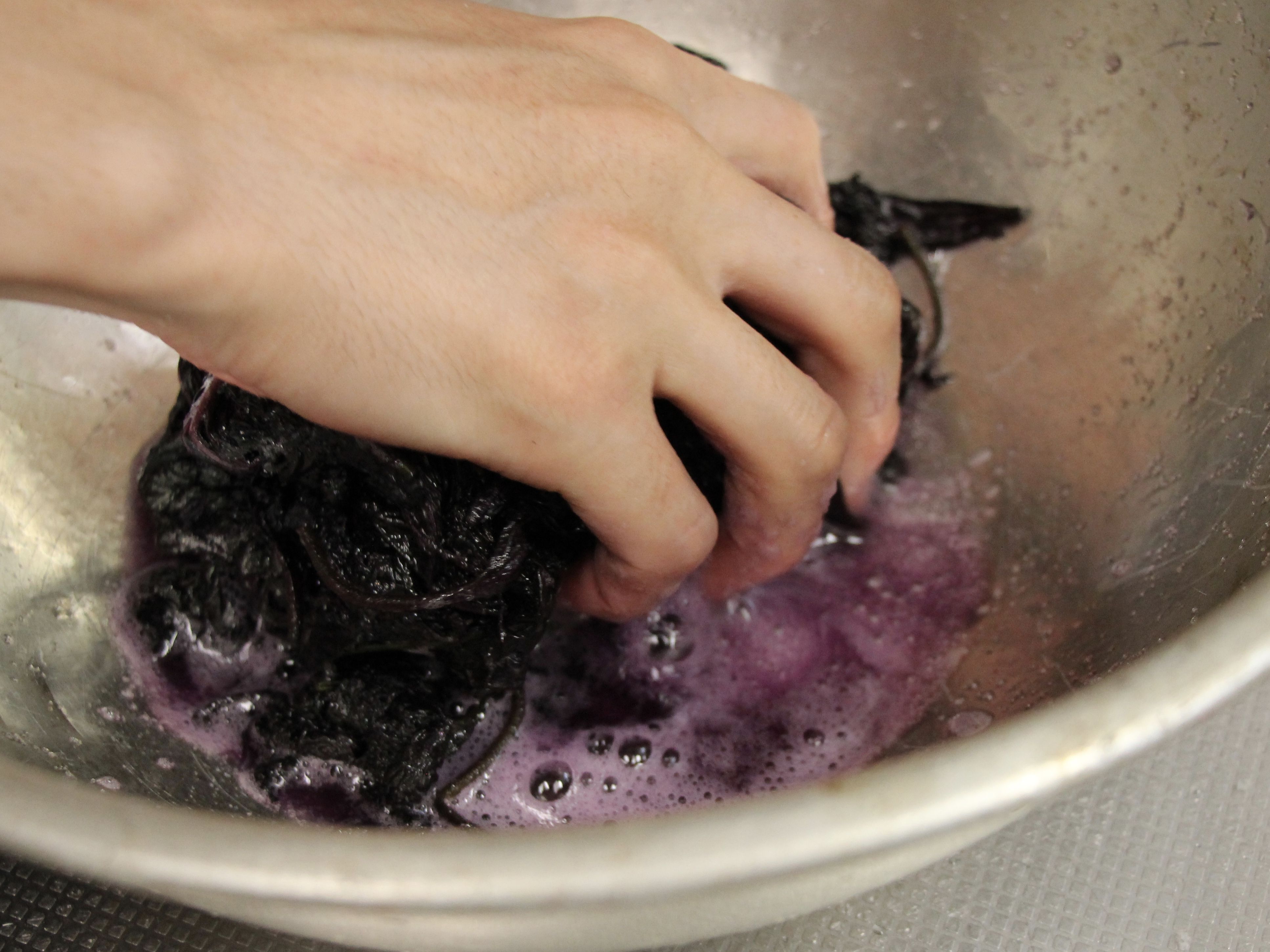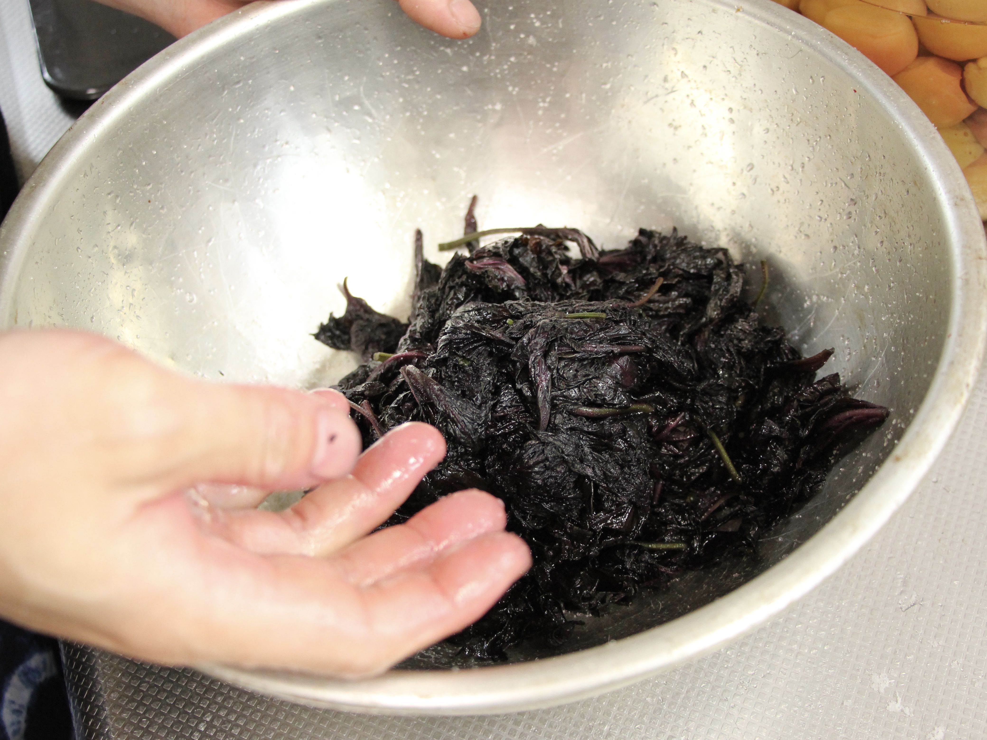 よき感じになったら、シソをギュッとしぼります。