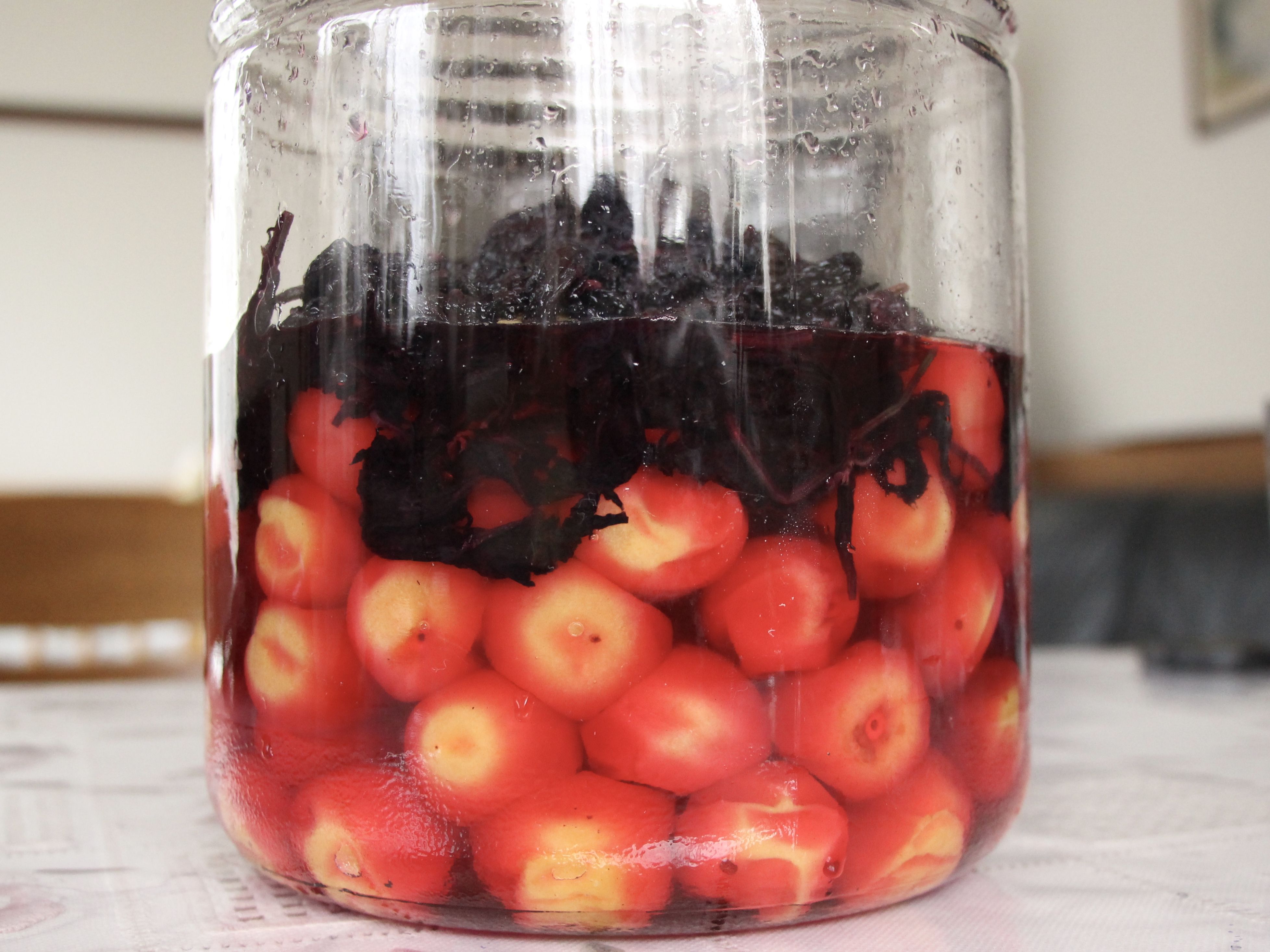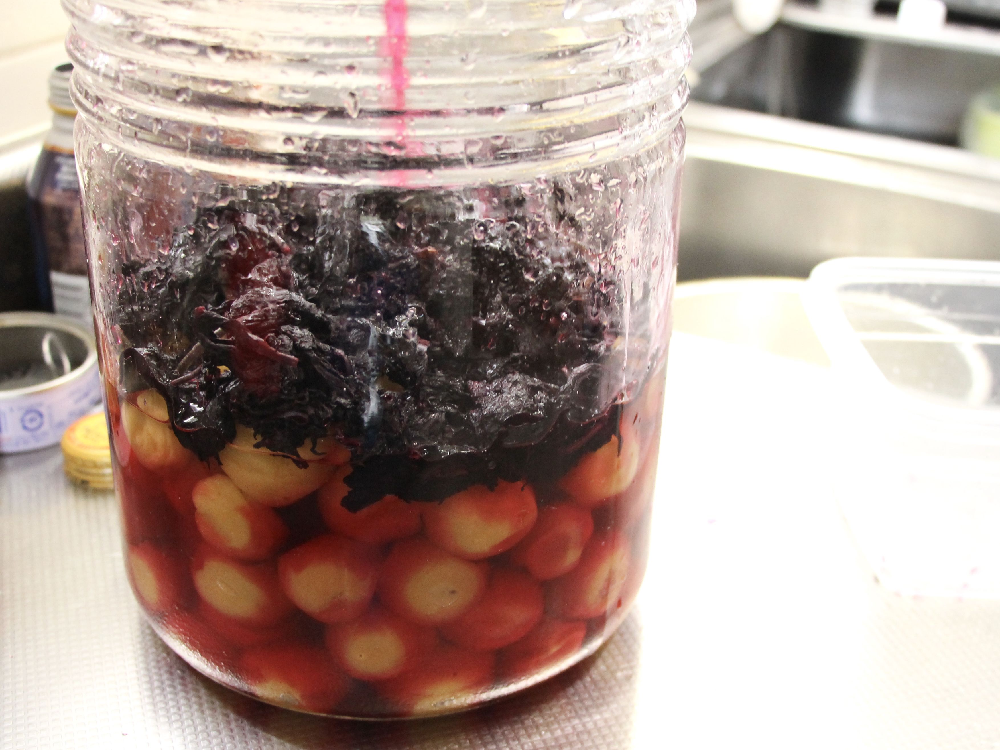そして、赤シソで染まった梅酢を瓶の中に戻して作業完了です!