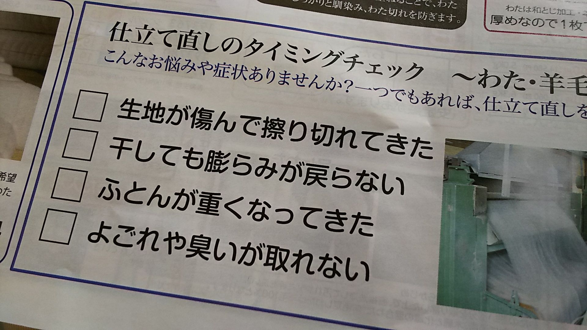 ある日、生協のチラシの中に「ふとん仕立て直し」という案内が混じっていまして。