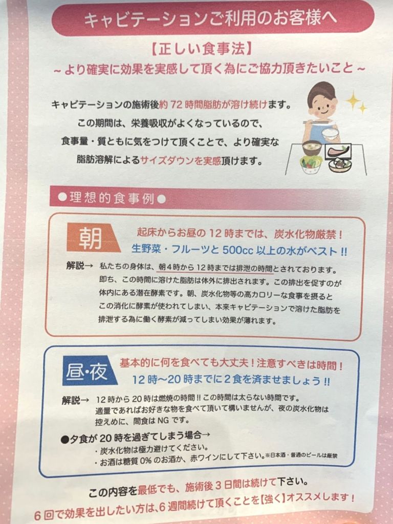 キャビテーションの施術関係なく、これを守り続ければ誰だって痩せそう…。それが出来へんからこそのキャビテーションだと思っていた自分が甘いのか…( ´_ゝ`)