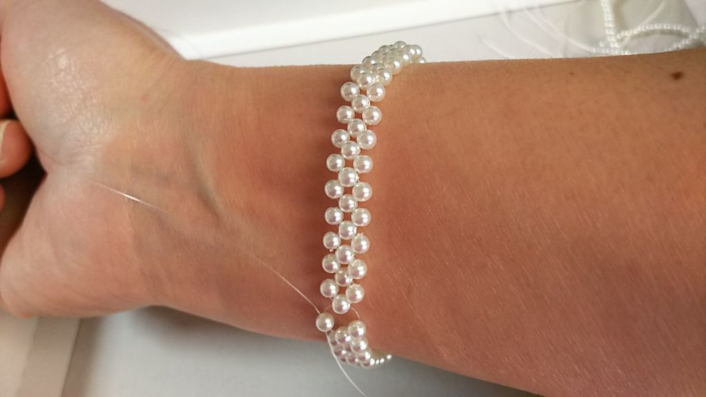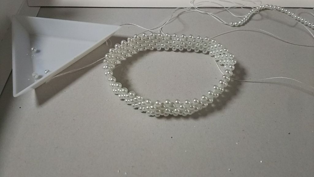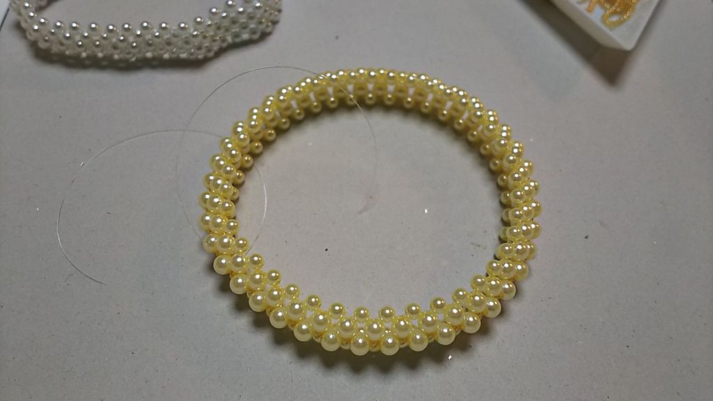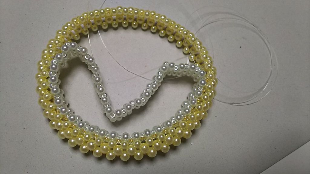 あとはこの2つのパーツを繋げたら完成。またもや特小ビーズが登場だけどめげない。うん、徐々にしっかりとバングルの形になってきたー!