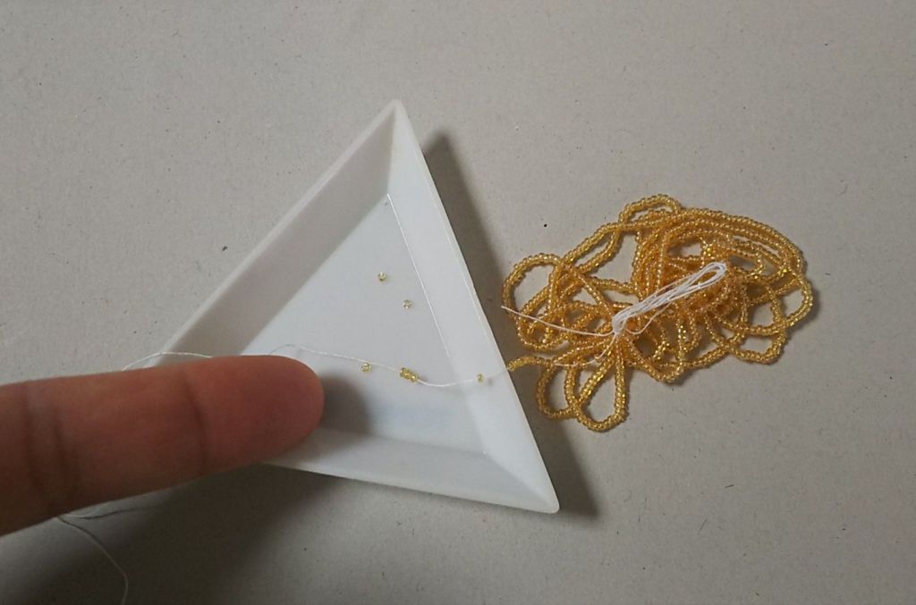 ここではパールの間に小さいビーズも入れていくのですが、これが一般的なビーズの中では一番小さい「特小」というサイズのもので・・・