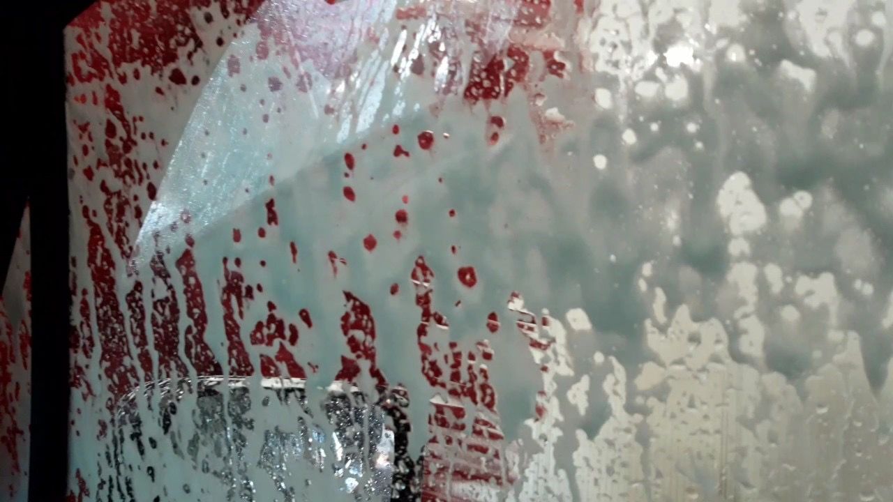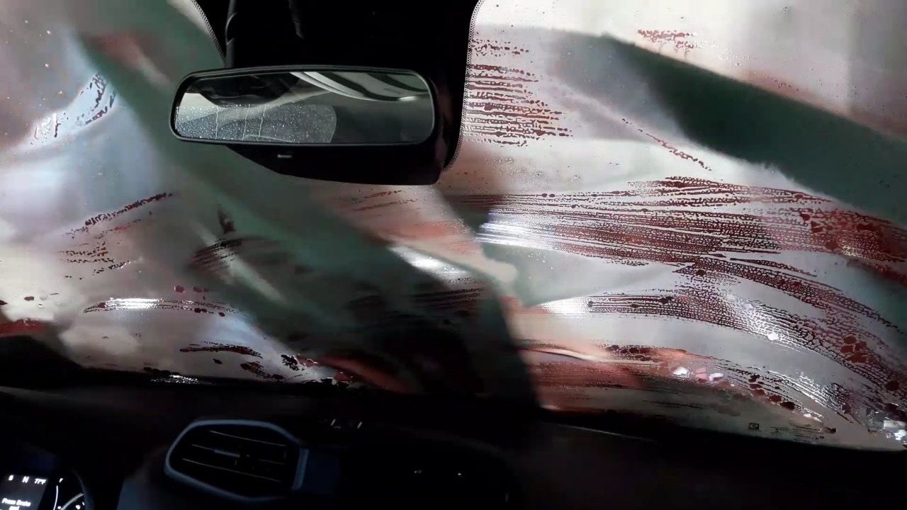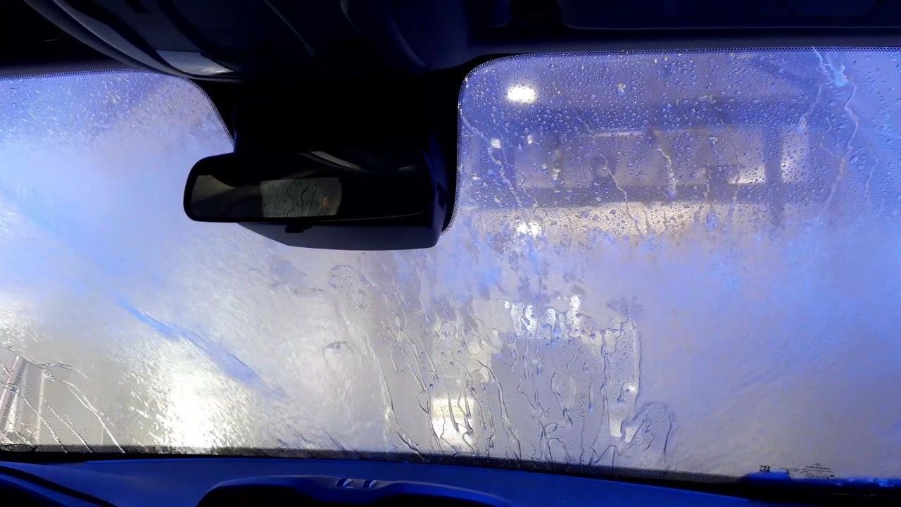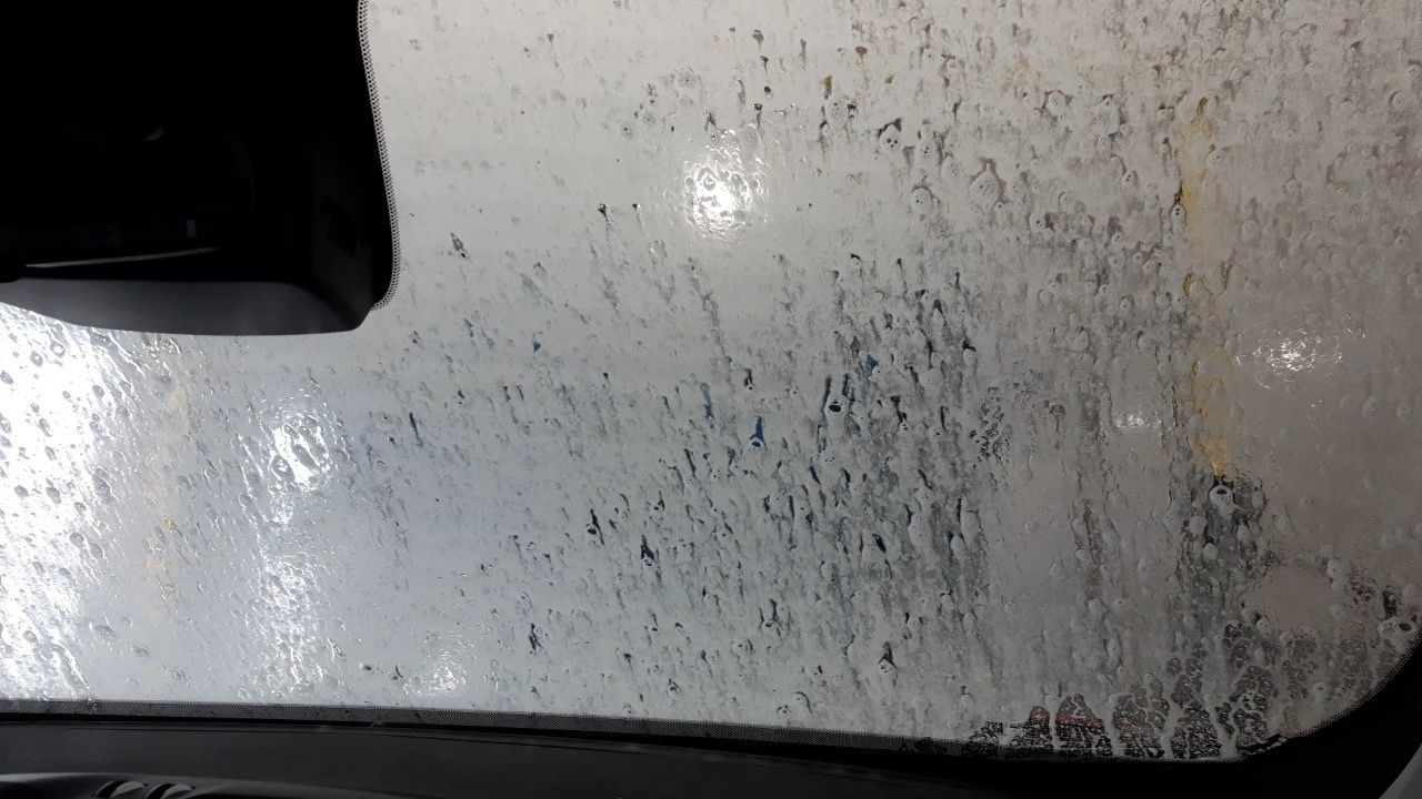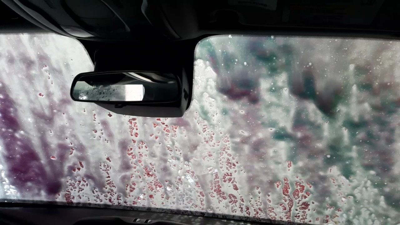 まずはフロントガラスに泡をまんべんなくブッシャーされ視界はゼロ
