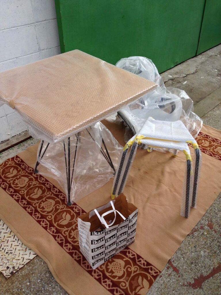 お客様お持ち込みの鉄脚に合わせて天板を製作し、取り付け加工しました。