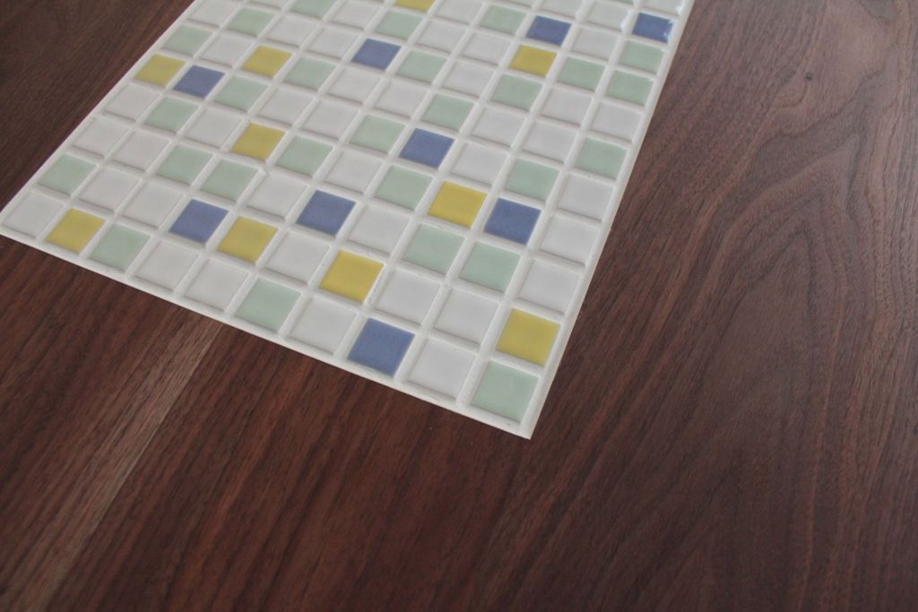 ルーツファクトリーでは無垢ウォルナットと無垢オークを組み合わせた「WELLテーブル」がありますが、センターの目立つところにカラフルでPOPなタイルをあしらうとまた全然別な雰囲気になります。