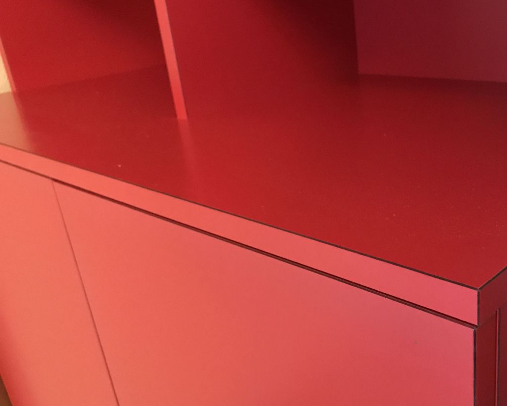 お客さまの絵から製作オーダーメイドの真っ赤なブックシェルフ扉付き