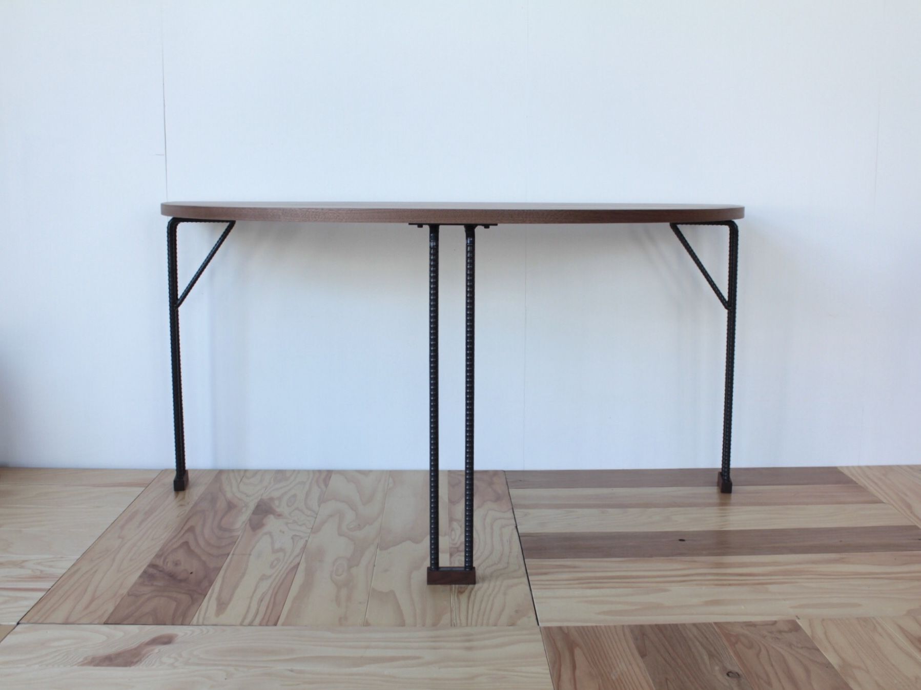 今回は、ウォルナット×アイアン脚で製作させていただいた半円テーブルをご紹介します。