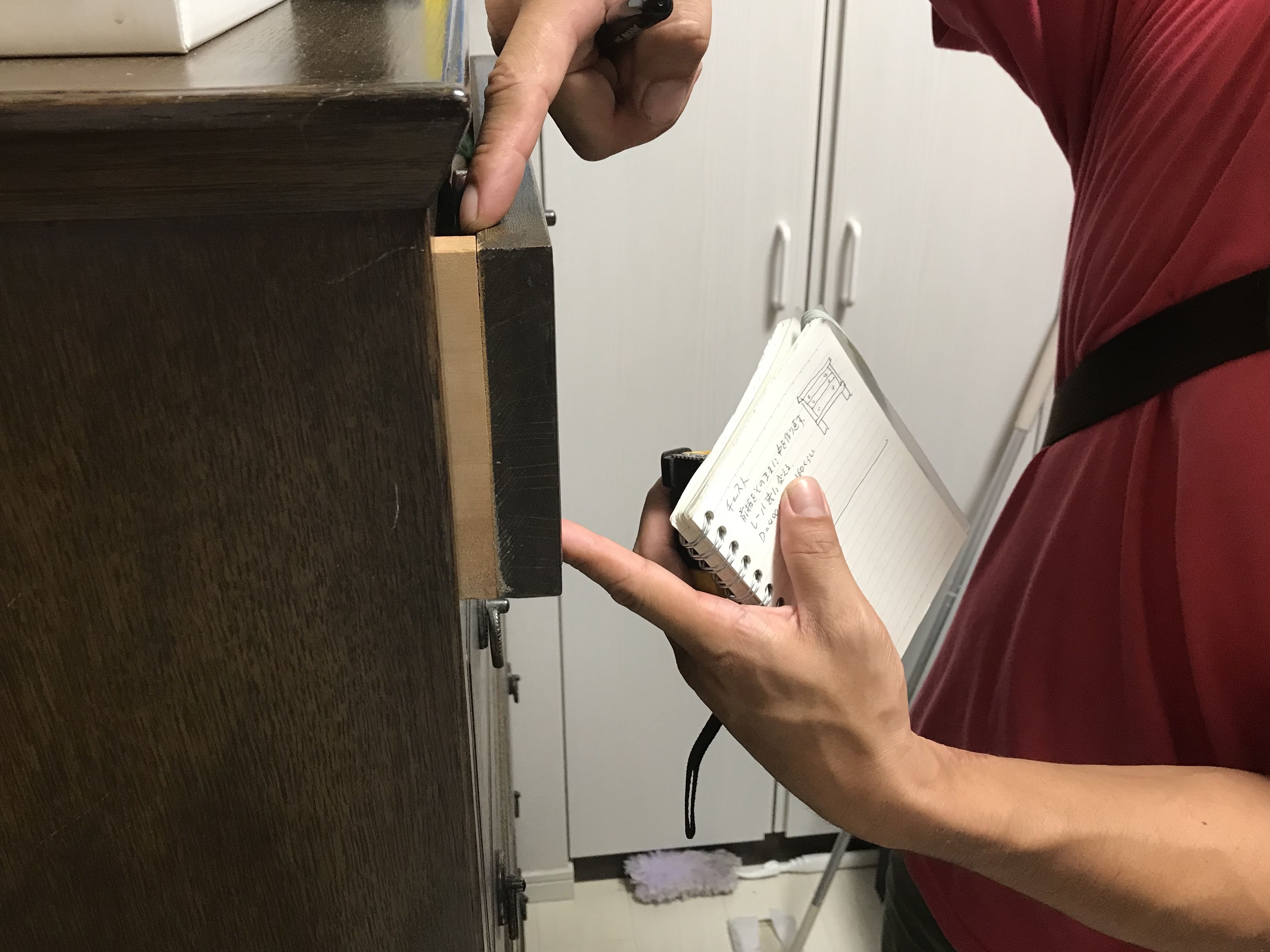 シモキタベースに電話でお問い合わせをいただいたんですけど、その内容は「タンスの木彫りが綺麗に残るように、前板を使って、チェストと食器棚を作ってほしい。」というものでした。