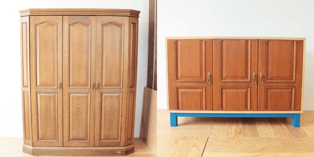 とても立派なナラ材のクローゼット、こちらを胸元ぐらいの高さの脚付きキャビネットにしたいとのご希望でした。