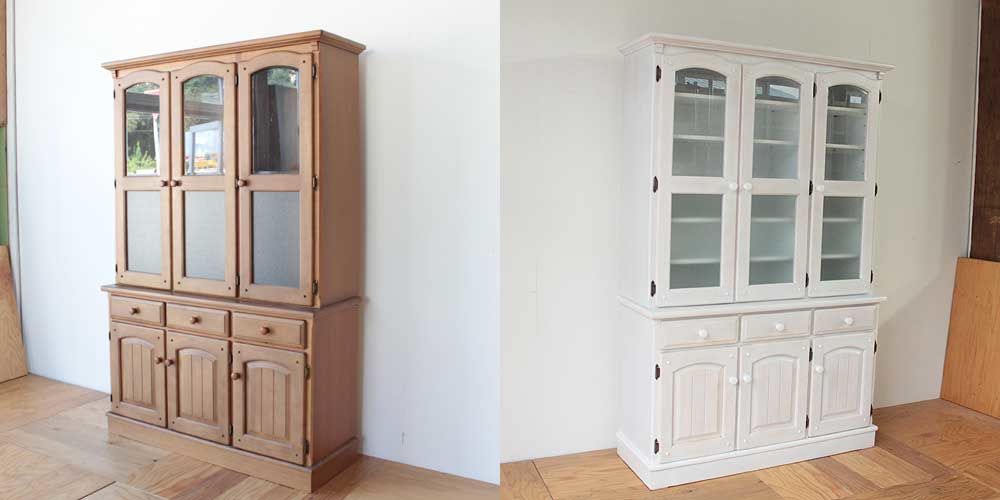 3枚扉の食器棚をホワイト塗装でリメイクしました。