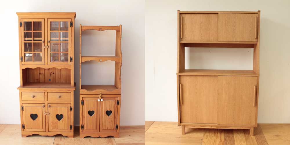 こちらがリメイク前。ハート型の彫刻がかわいい、カントリー調の食器棚です。