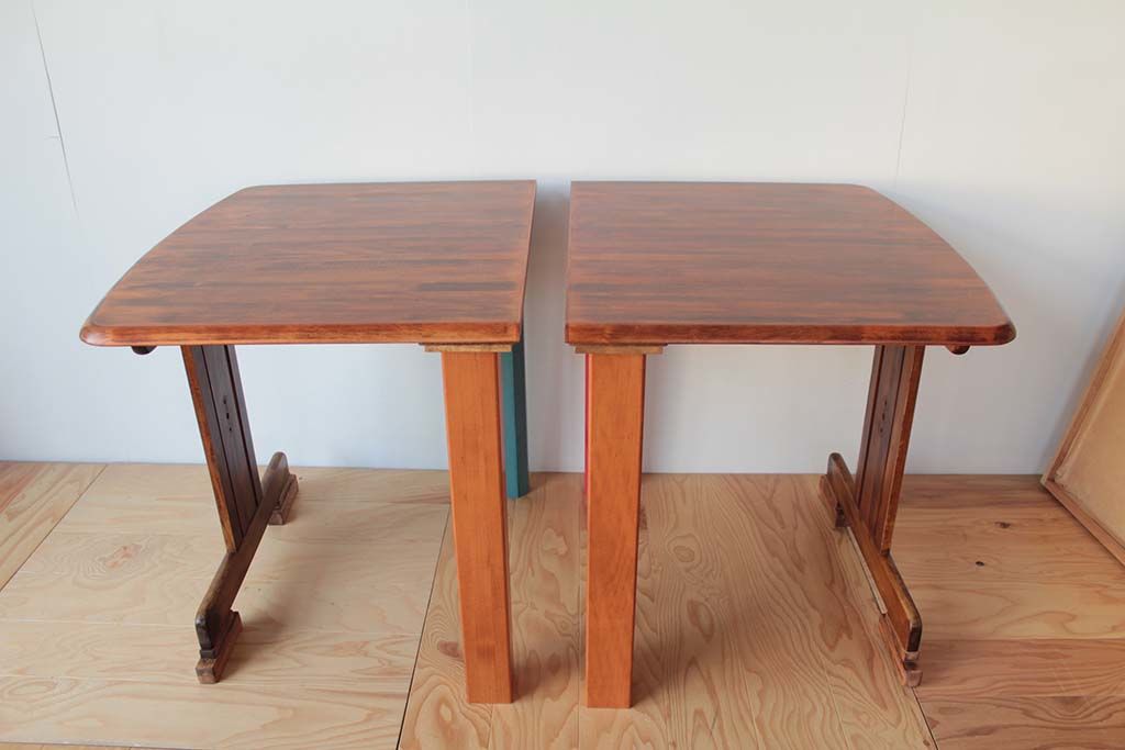 天板を2分割し、元の脚をいかしながらも色と形の違う新しい脚をとりつけることで、モダンでユニークなテーブルに仕上がりました。