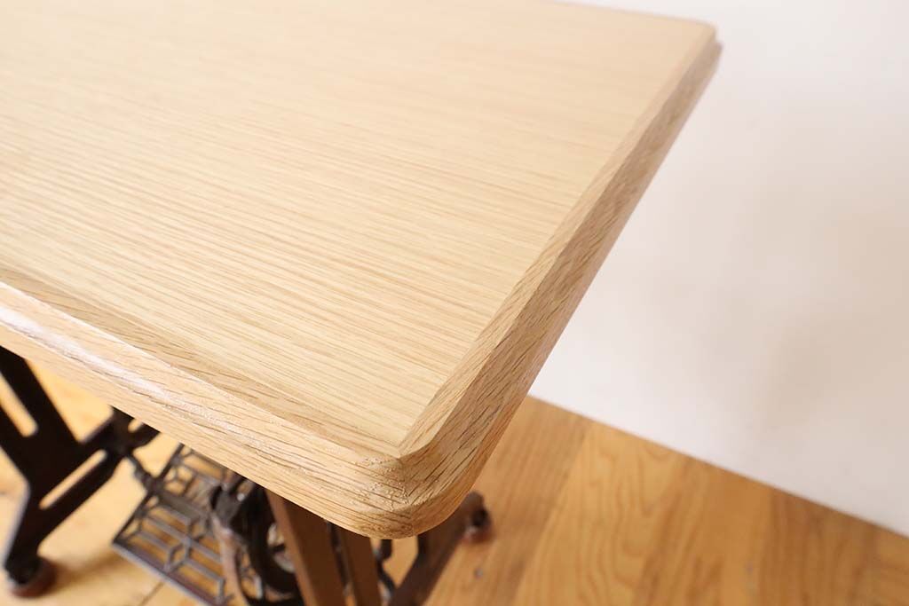 当初はインテリアとして活用したいというご相談でしたが、せっかくなら作業にも使えるようにと、フラットな天板をご希望されました。脚の部分はそのまま残し、ミシンの開口部があった天板は、新たに丈夫な材で製作しています。