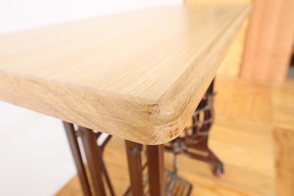 天板の縁取りも、もとのデザインに合わせて丁寧に面取り加工を施しました。インテリアとしても、作業用デスクとしても安心してお使いいただけます。