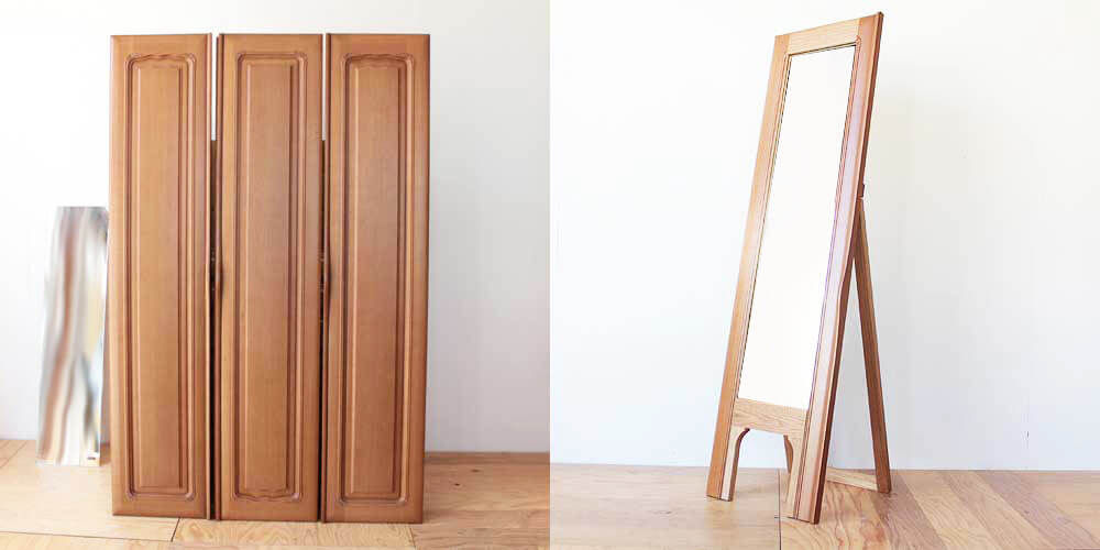 R0147:婚礼タンスの鏡付き扉を生かしてスタンドミラーにリメイク