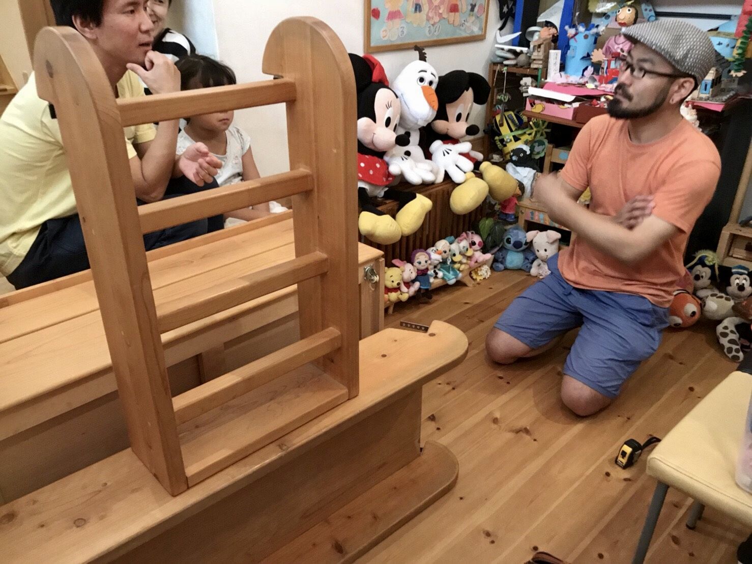 ベッド下収納の引き出し前板や、ベッドのはしご、滑り台などを使用して、お子さんの作品を並べる飾り棚を製作しました。