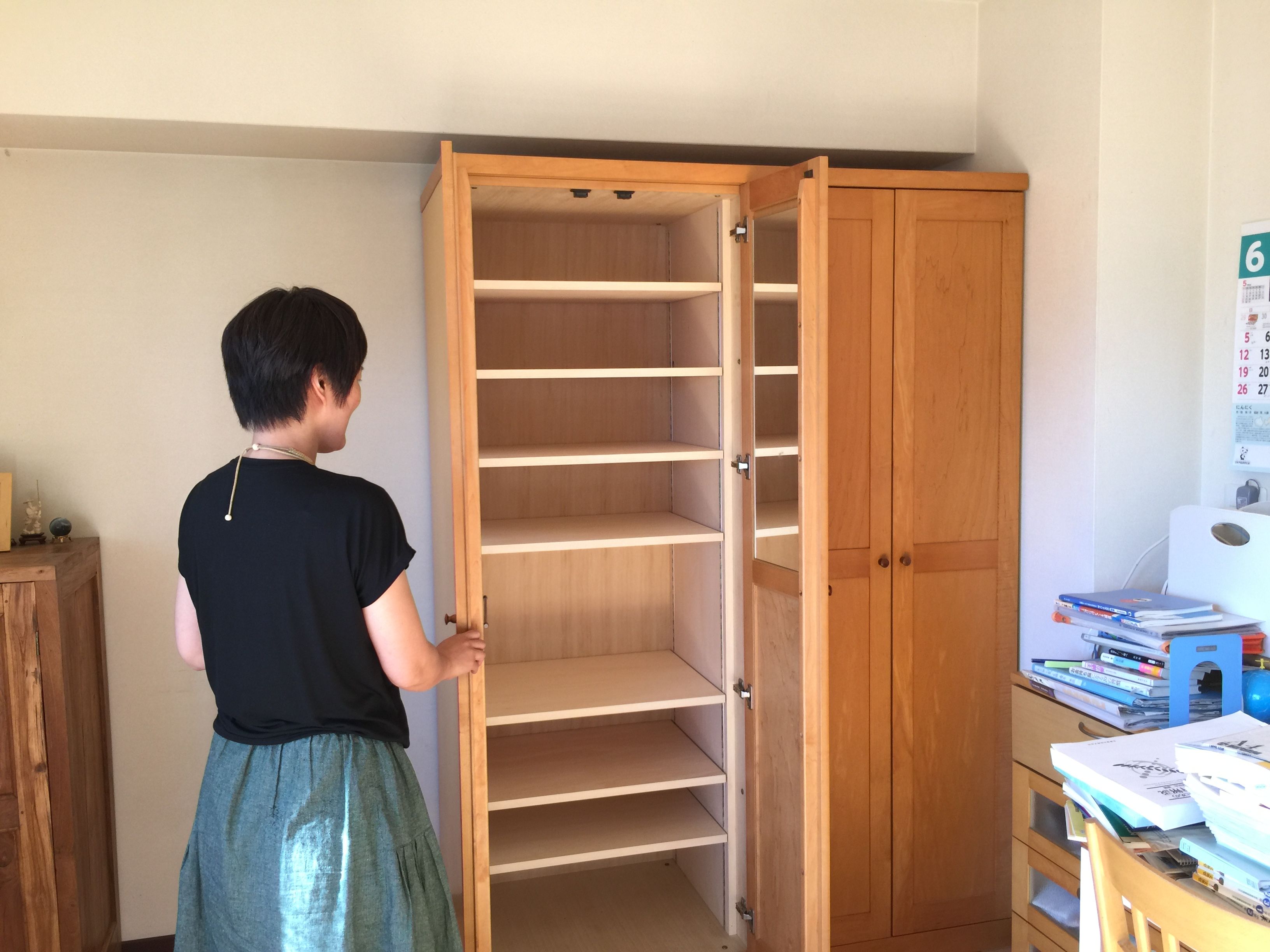 そこで、洋服箪笥の内側にぴったりのサイズで本の重量に耐えられる棚をつくってそれを仕込む、というリメイクをさせて頂きました。あくまで見た目はそのまま、用途だけを変える、というリメイクです。