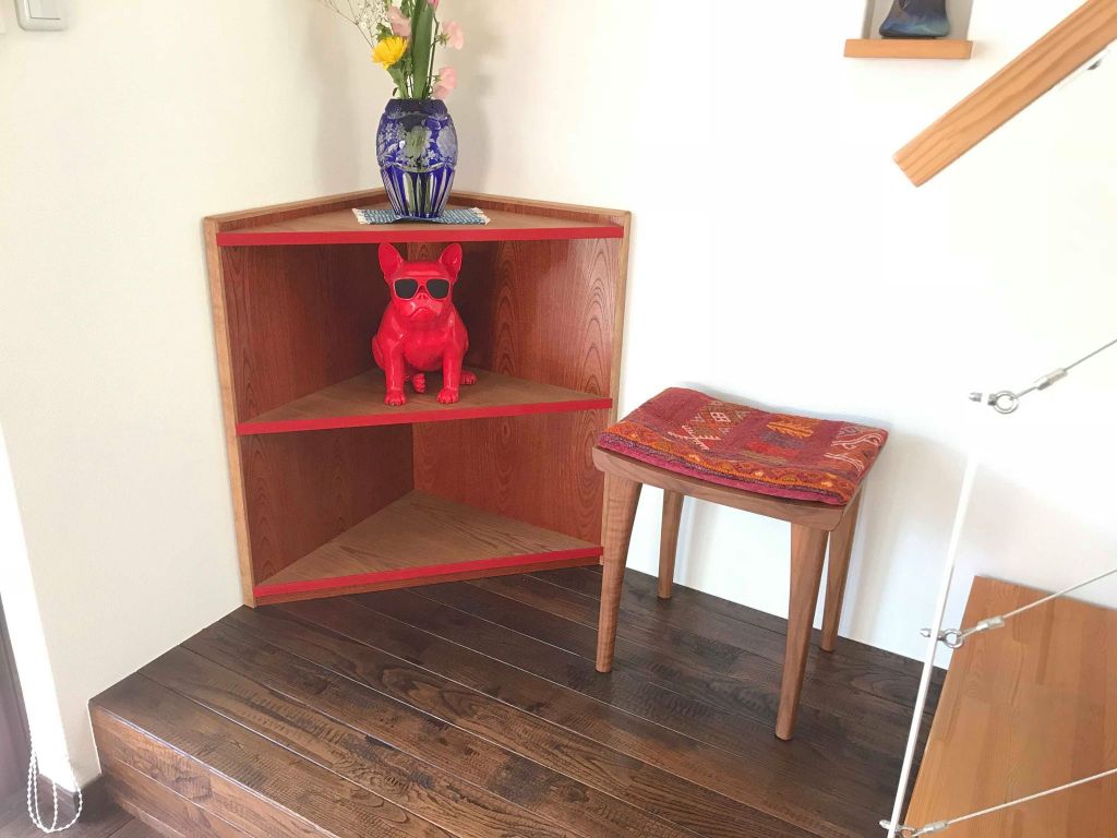 美しい欅の木目を生かしてコーナーシェルフをつくりました。写真には写っていませんが裏面も仕上げてあるのでコーナー以外でもお使い頂けます。