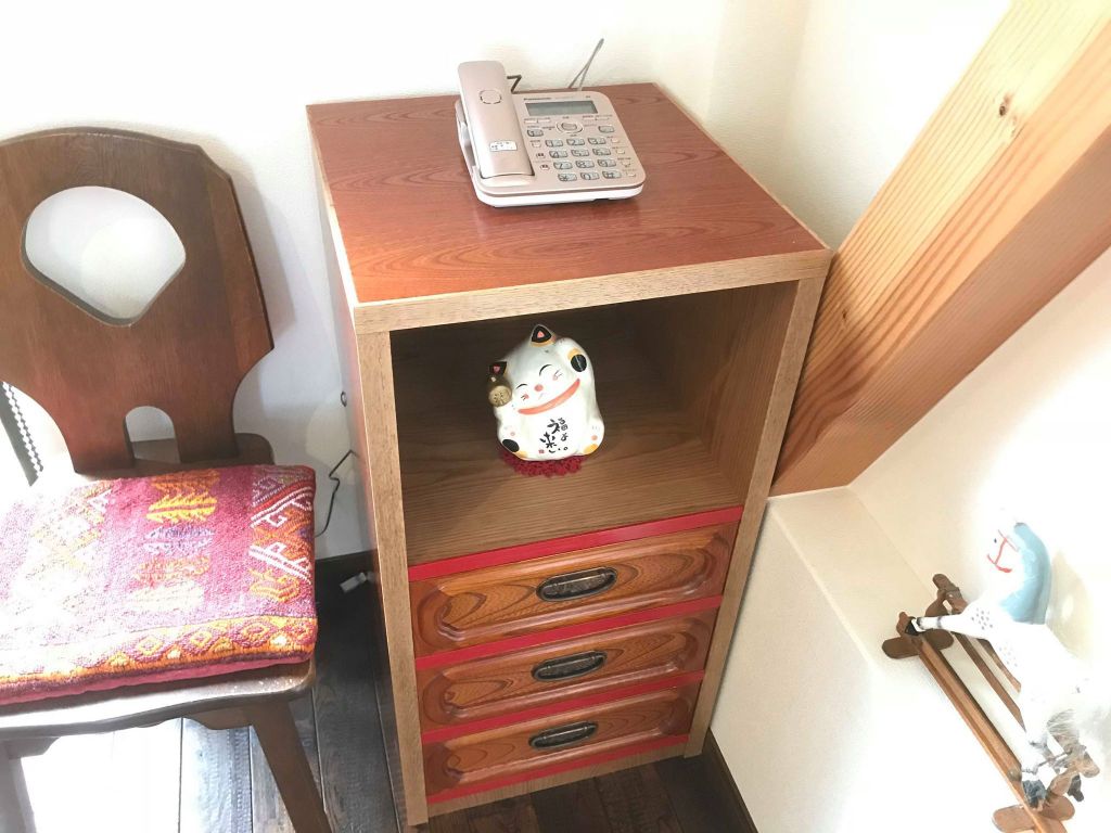 しっかりと造られた欅の引出しと、木目の美しい側板を使用して電話代に仕上げました。こちらも裏面まで仕上げてあるので壁につけなくてもご使用い頂けます。