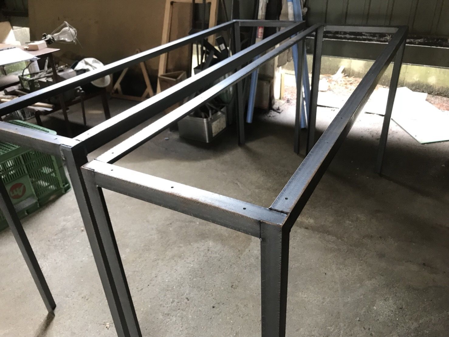 取り付け用の穴をあけたり、脚の底に床に傷が付かないように鉄板を溶接してから、黒皮(酸化皮膜)仕上げにしたら出来上がりです。