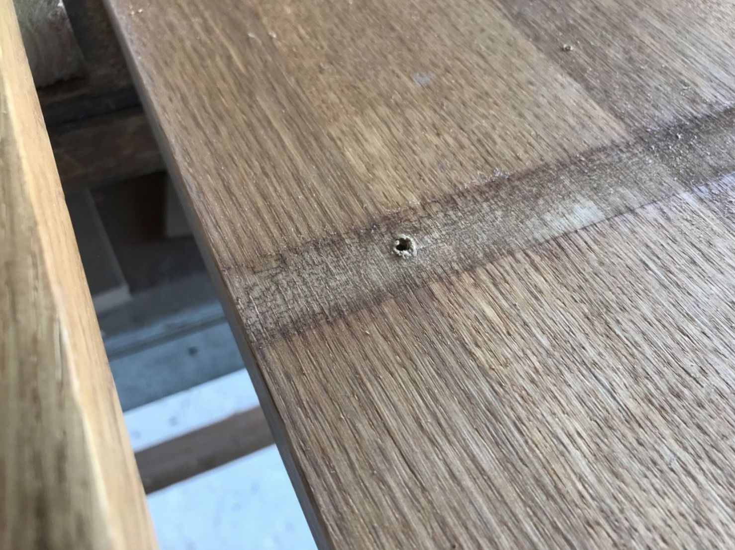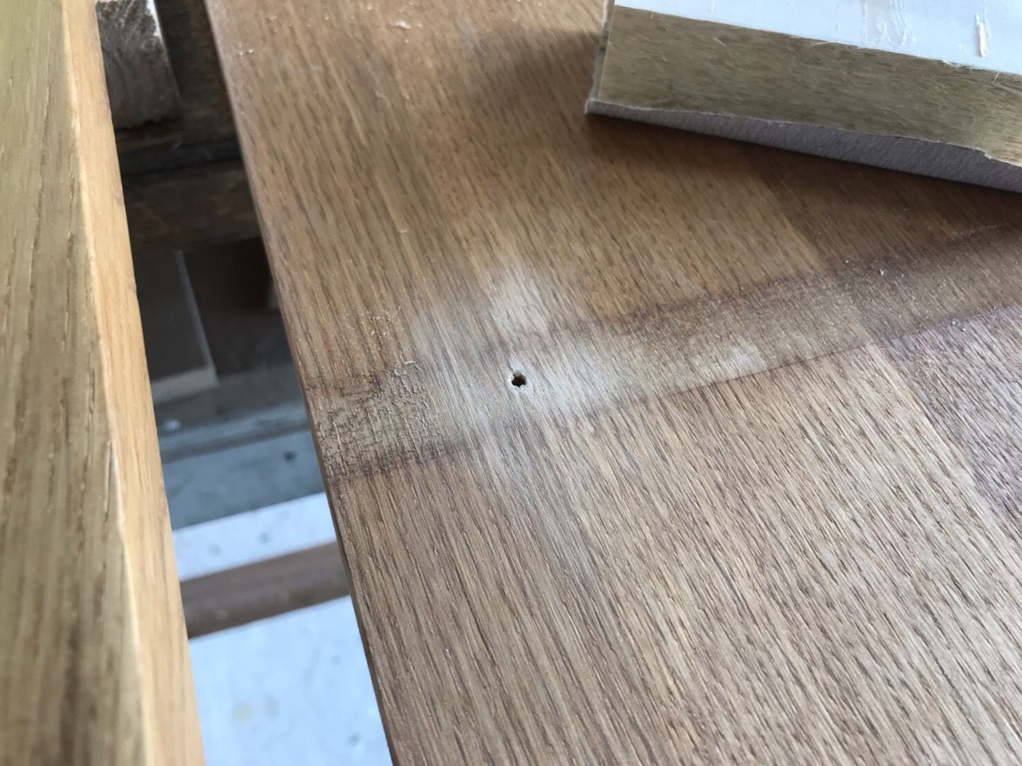 今回のご依頼は「塗装は小口(カットした面)だけであとはそのまま」と云う内容でした。でも、↓のように裏面のビスを外した穴がバリになっています。