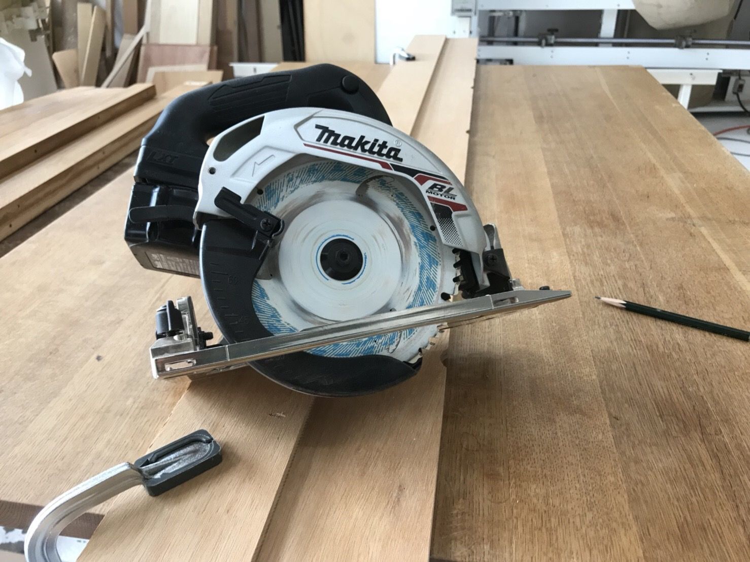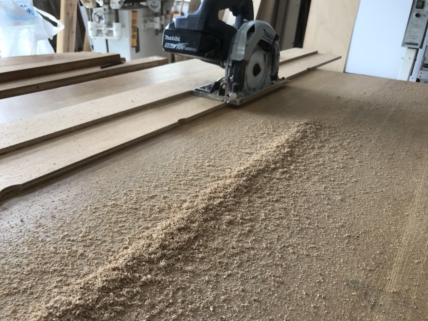丸鋸ガイドは2枚の板を組み合わせた自家製です。簡単にできるので用意しておくとDIYにとっても役立ちます。