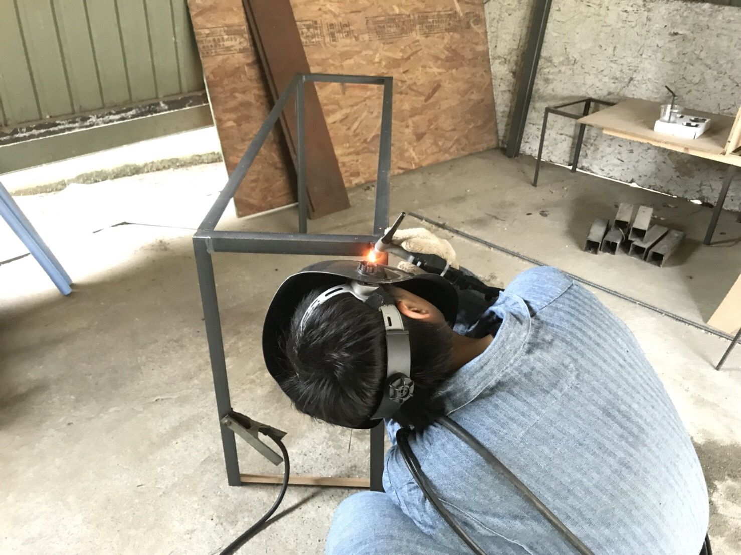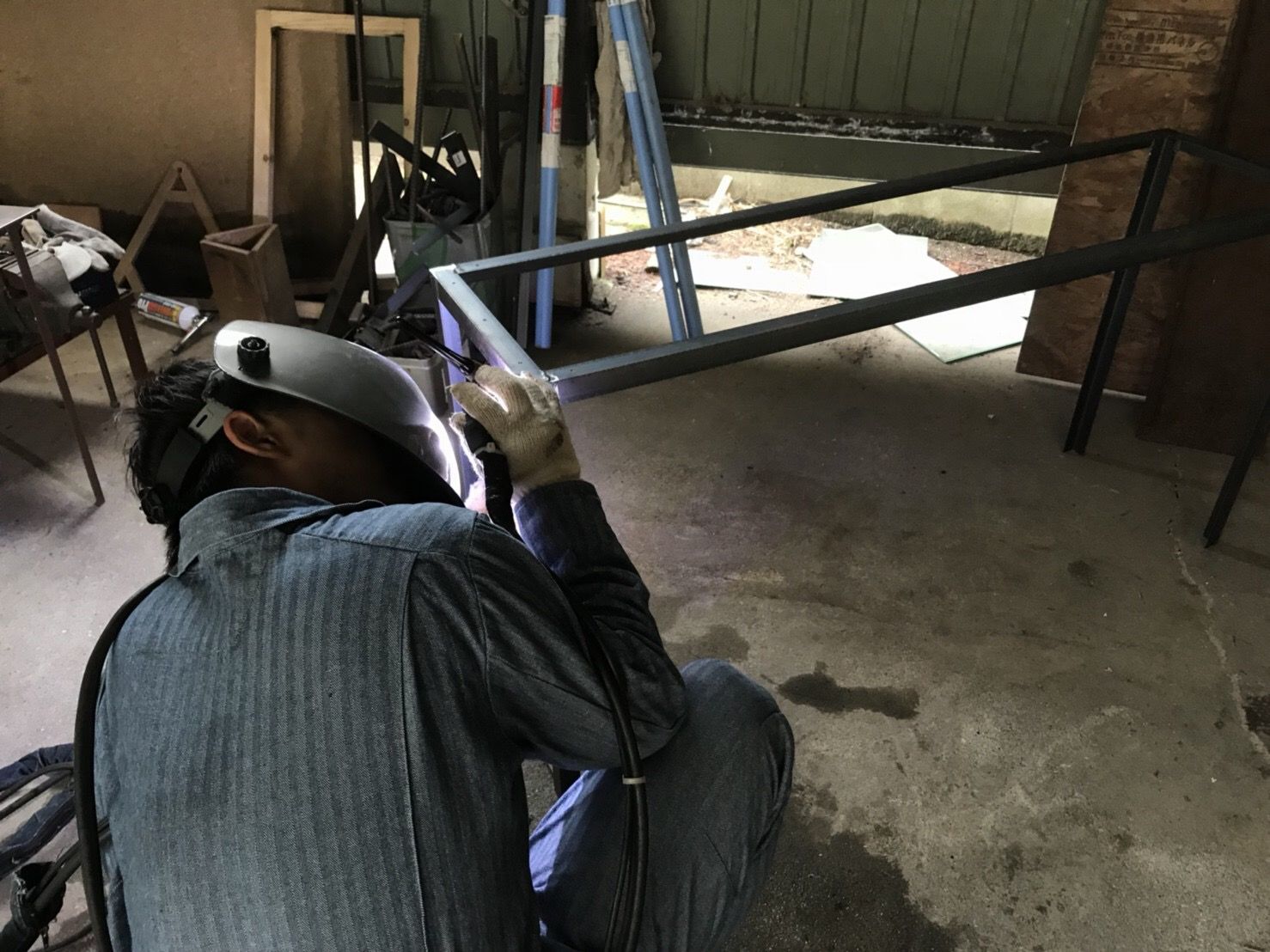 天板サイズに合わせて溶接。アイアンフレームの製作