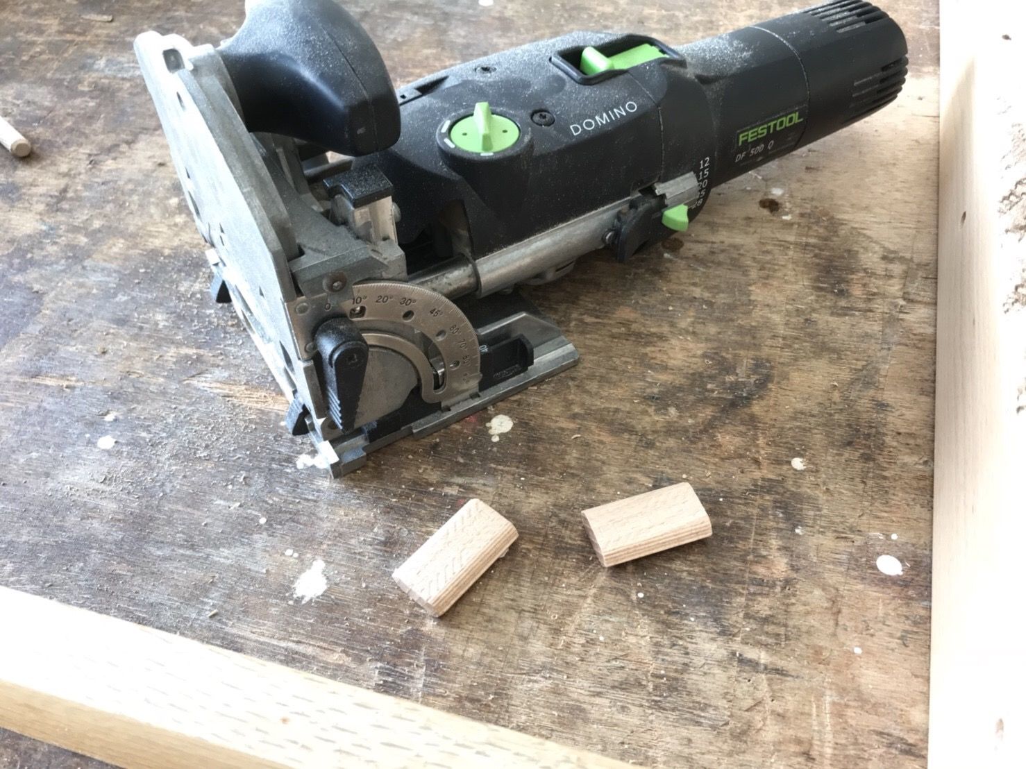 ちなみにこちら、写真ではわかりませんが、棚板を裏からビスでもんだりせず、「ドミノ」というほぞ組み加工機を使い組み上げています。