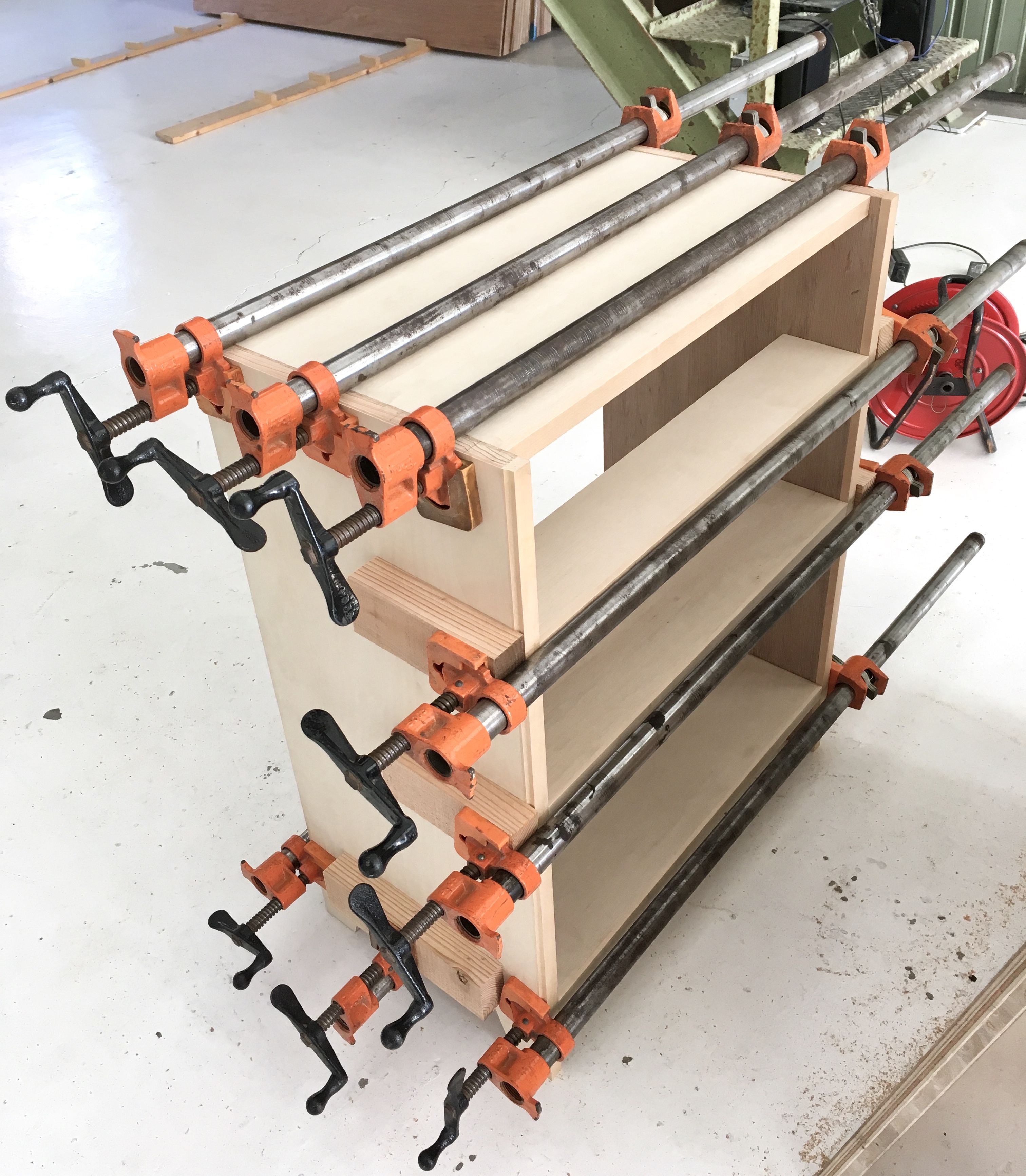 (しっかりと接着させるために↓のように「クランプ」で挟み込むんですけど、このように90度で抑えられないから手間がかかるみたいなのです。)