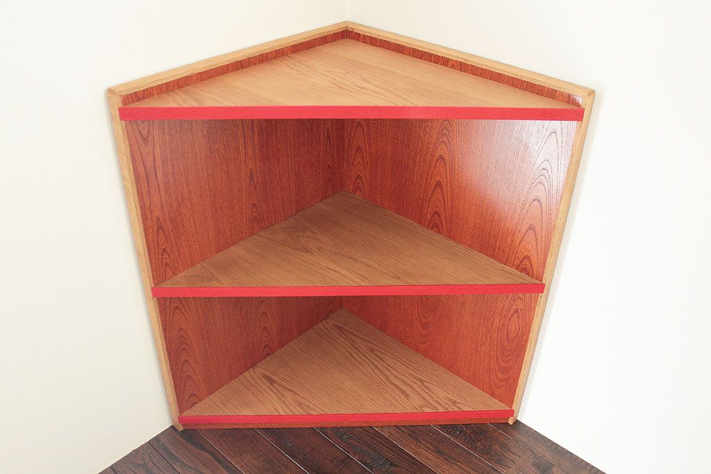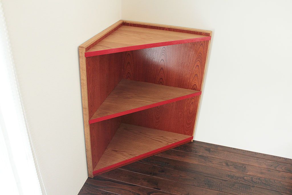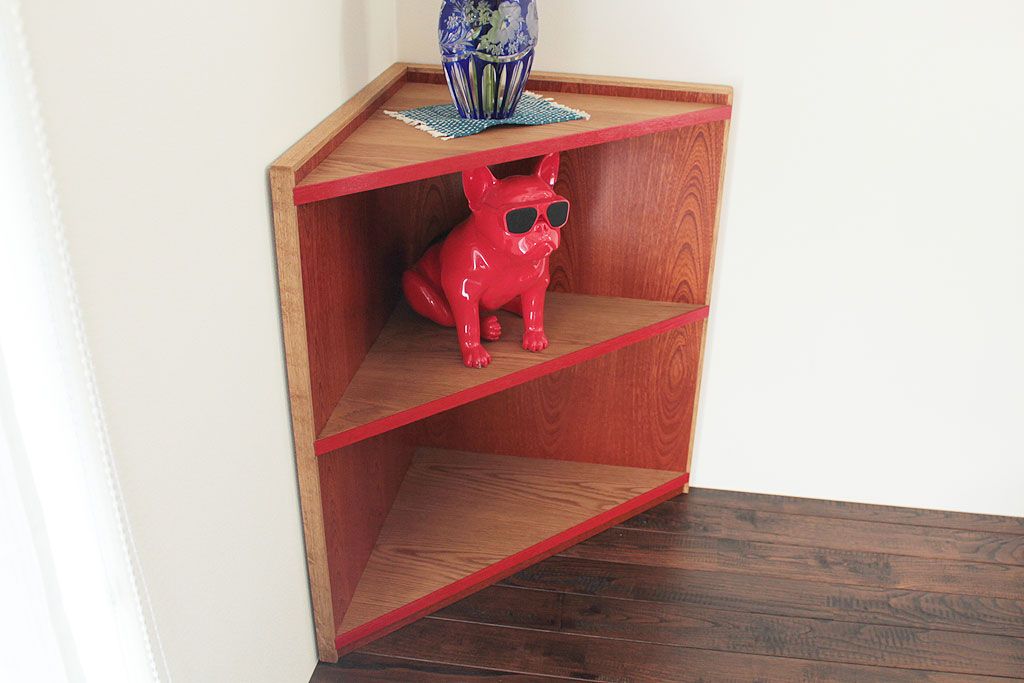 欅の婚礼家具をお洒落なコーナーシェルフにリメイク。紅色がポイント