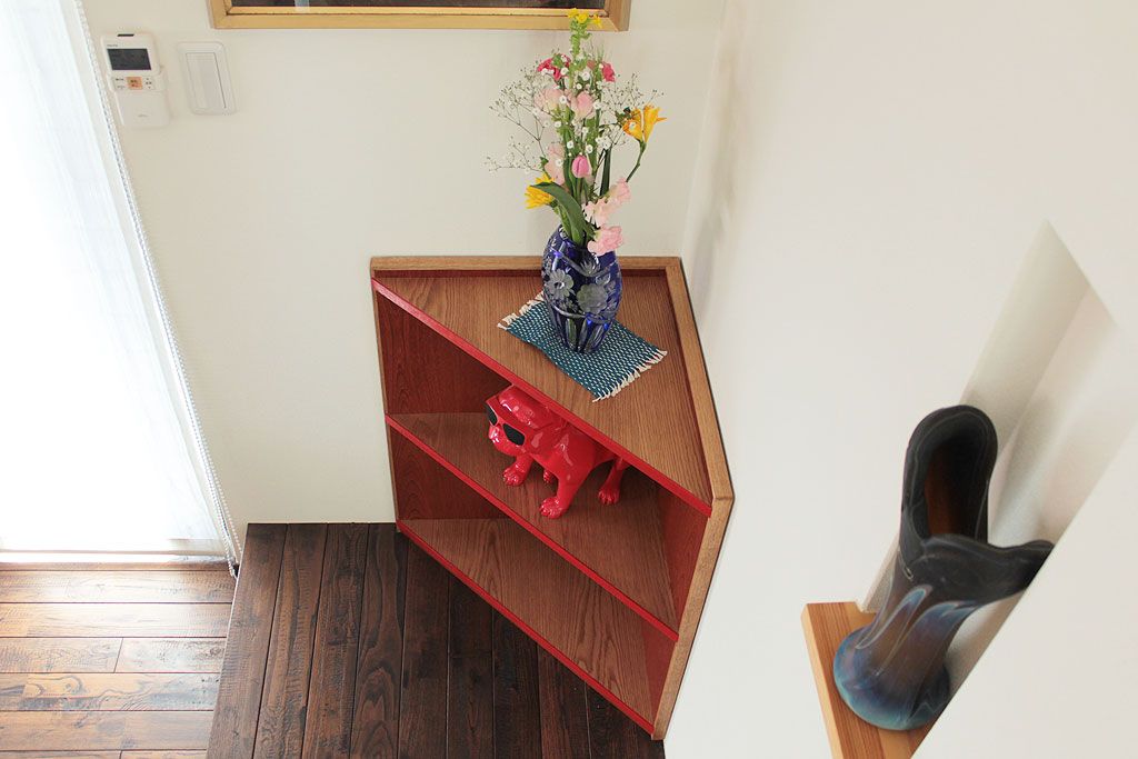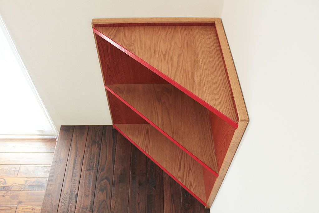 棚板のフチを、お客様の好きな色「赤」で仕上げています。