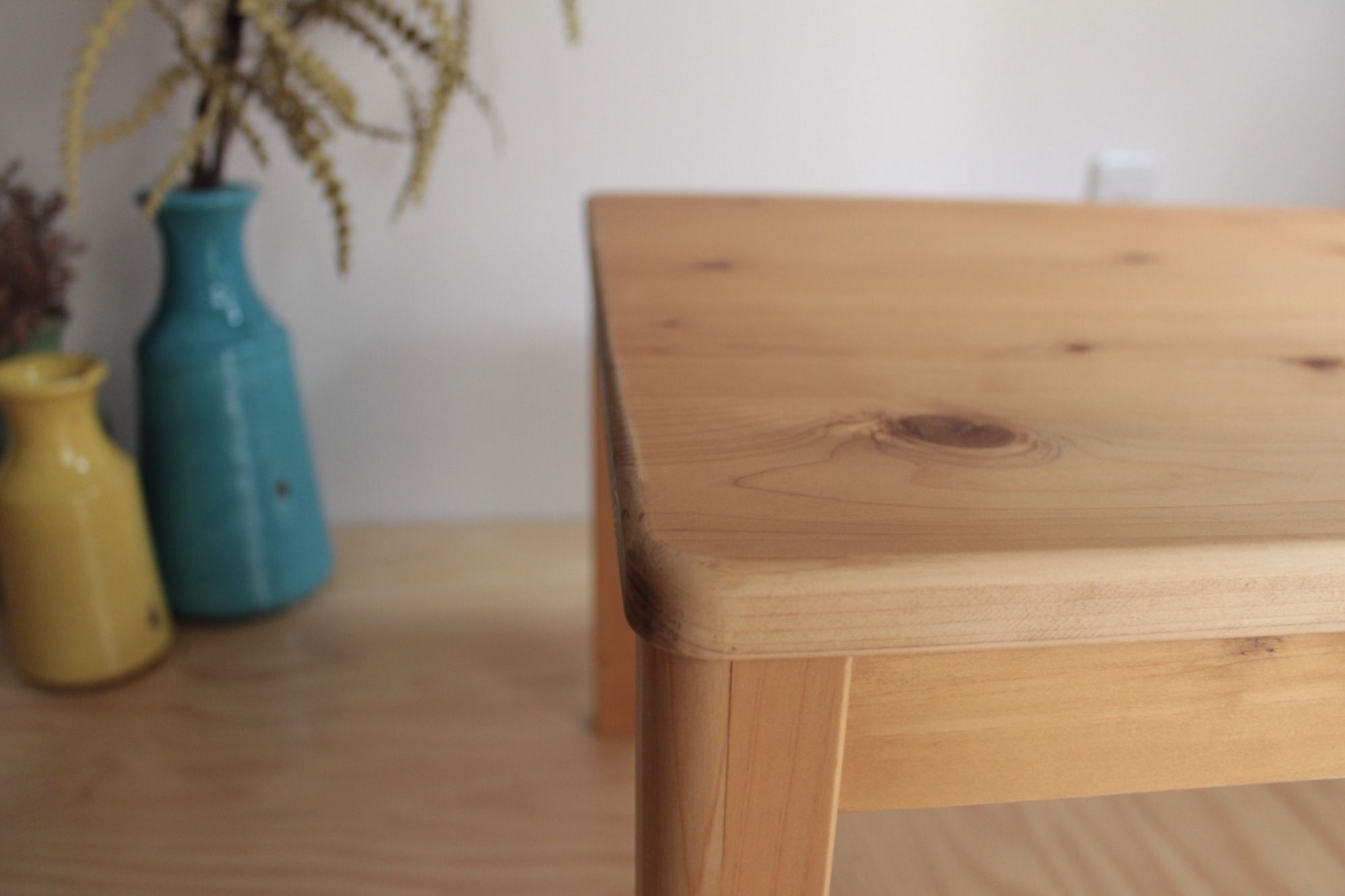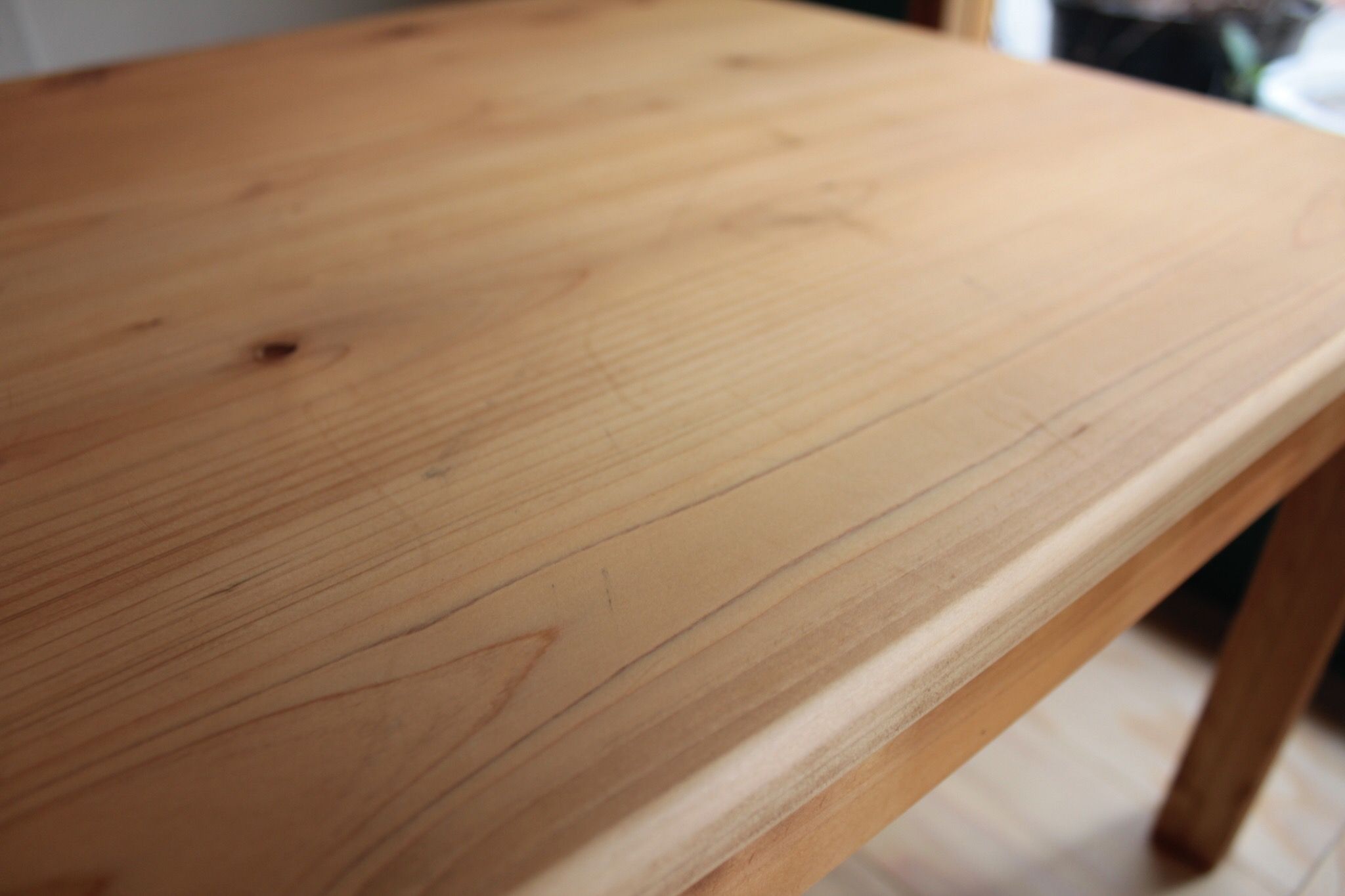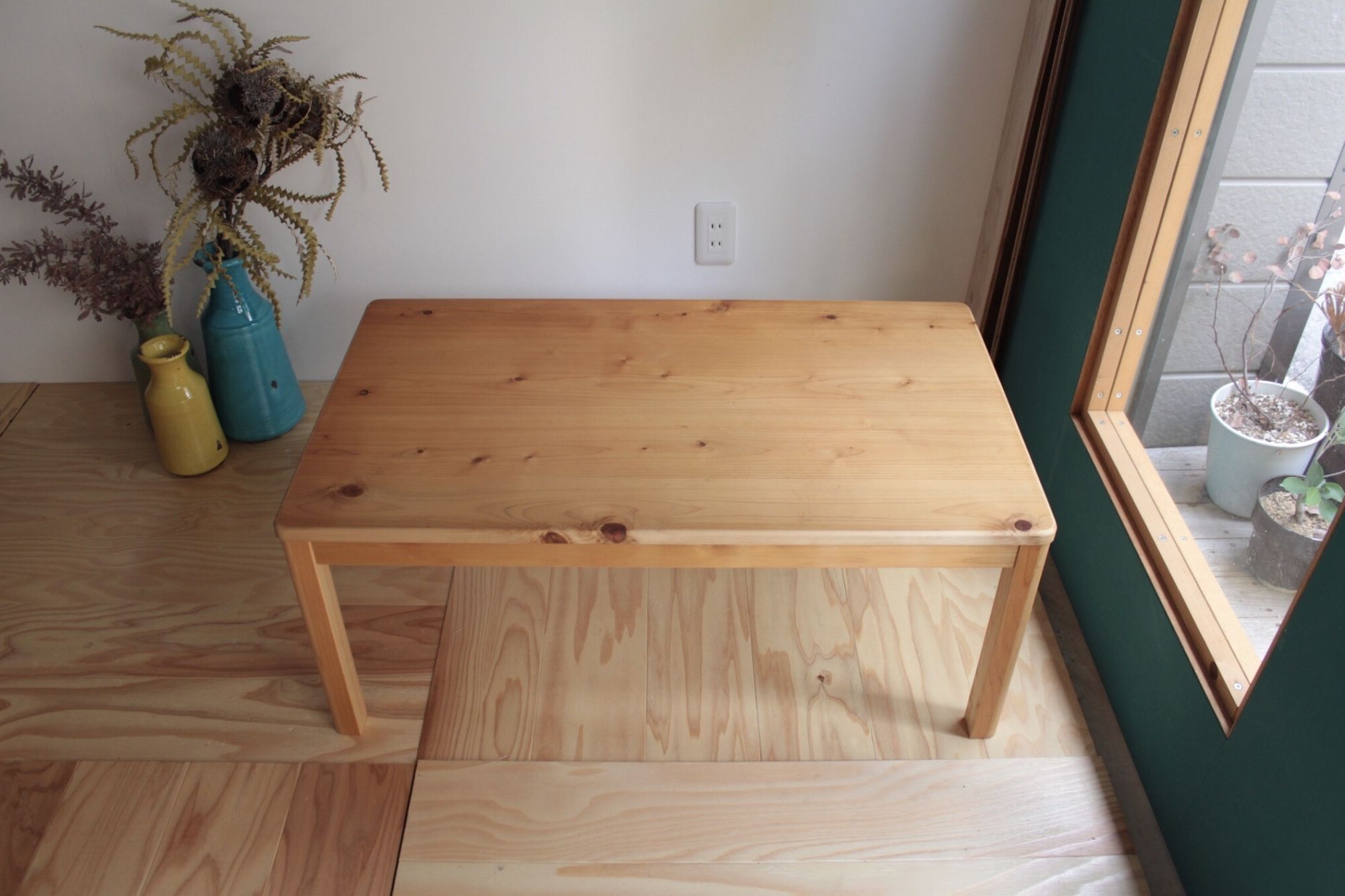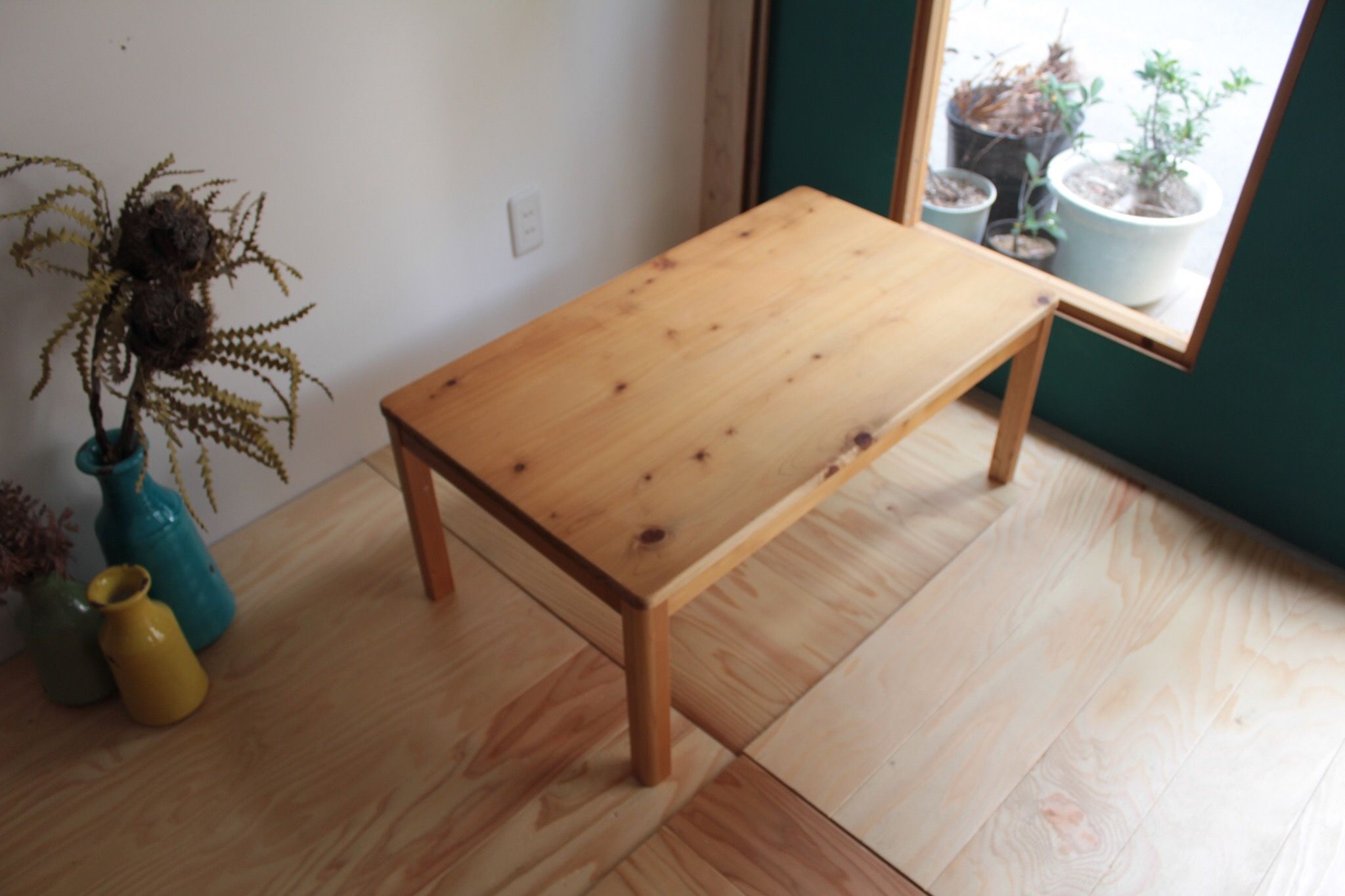 パイン材でできたベッド下収納の天板を、綺麗に取れる範囲でなるべく大きく切り出し、ローテーブルの天板にしました。