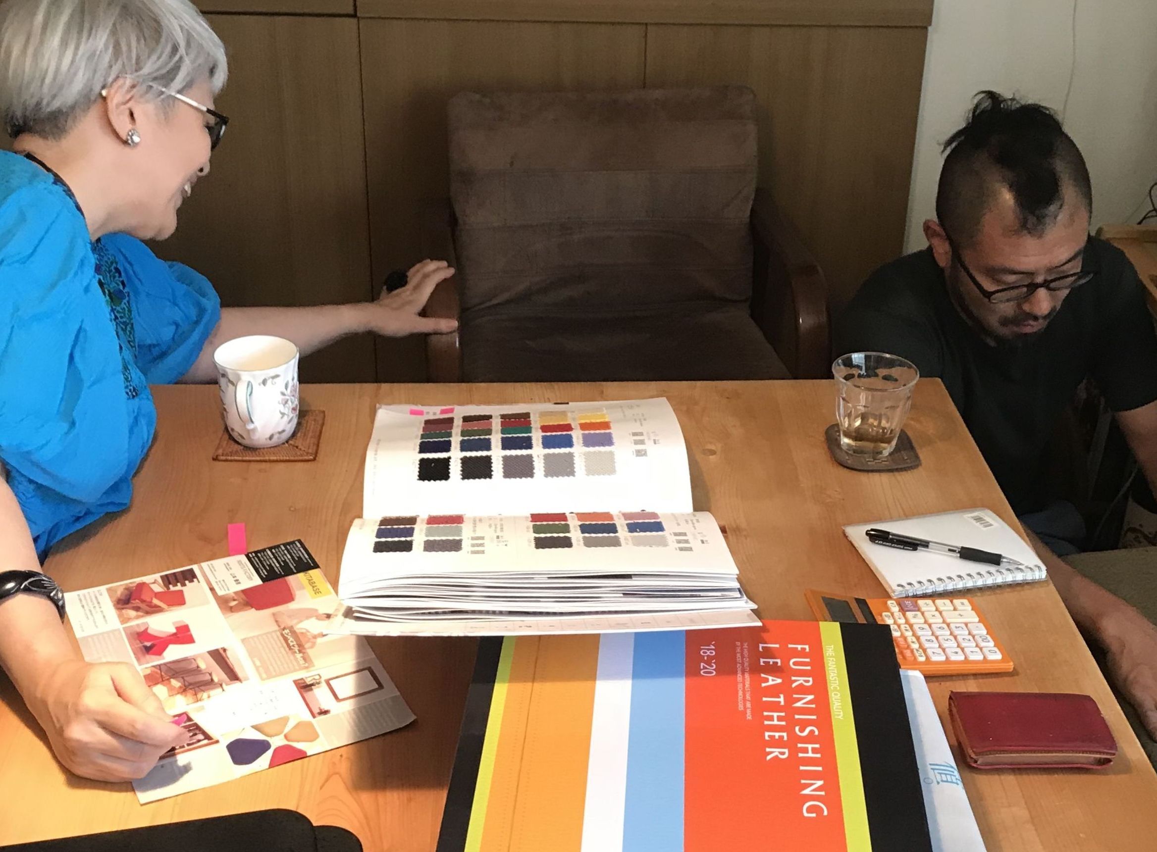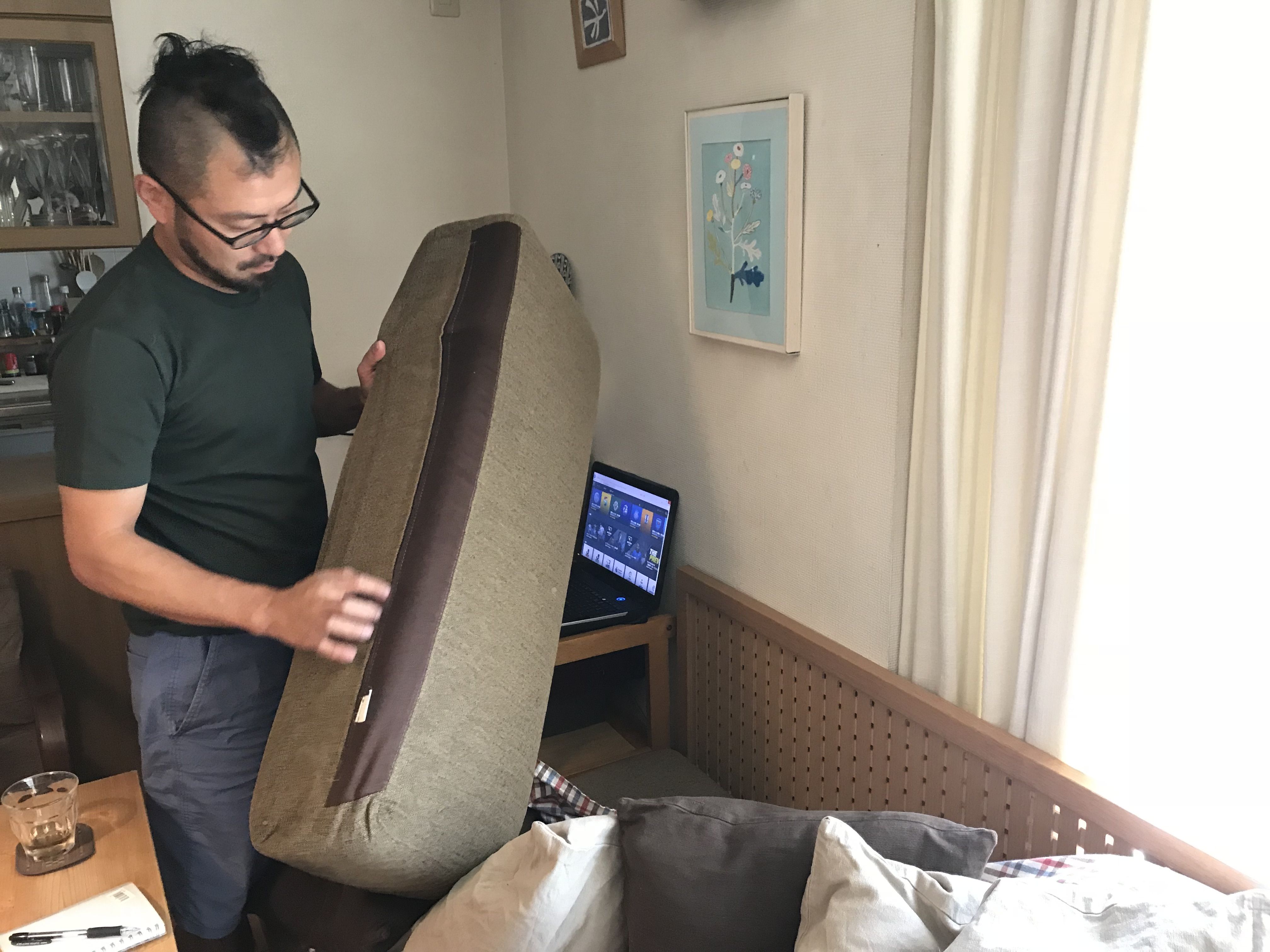 ただ張り替えたいというだけでなく「せっかくなら、センスの良い方に家を見ていただいて、気の利いた感じに張り替えたいわ。」とご相談くださったので、家具作りたいおっさんが直接お客様のお家に伺い、一緒に生地選びから始めました(^^)
