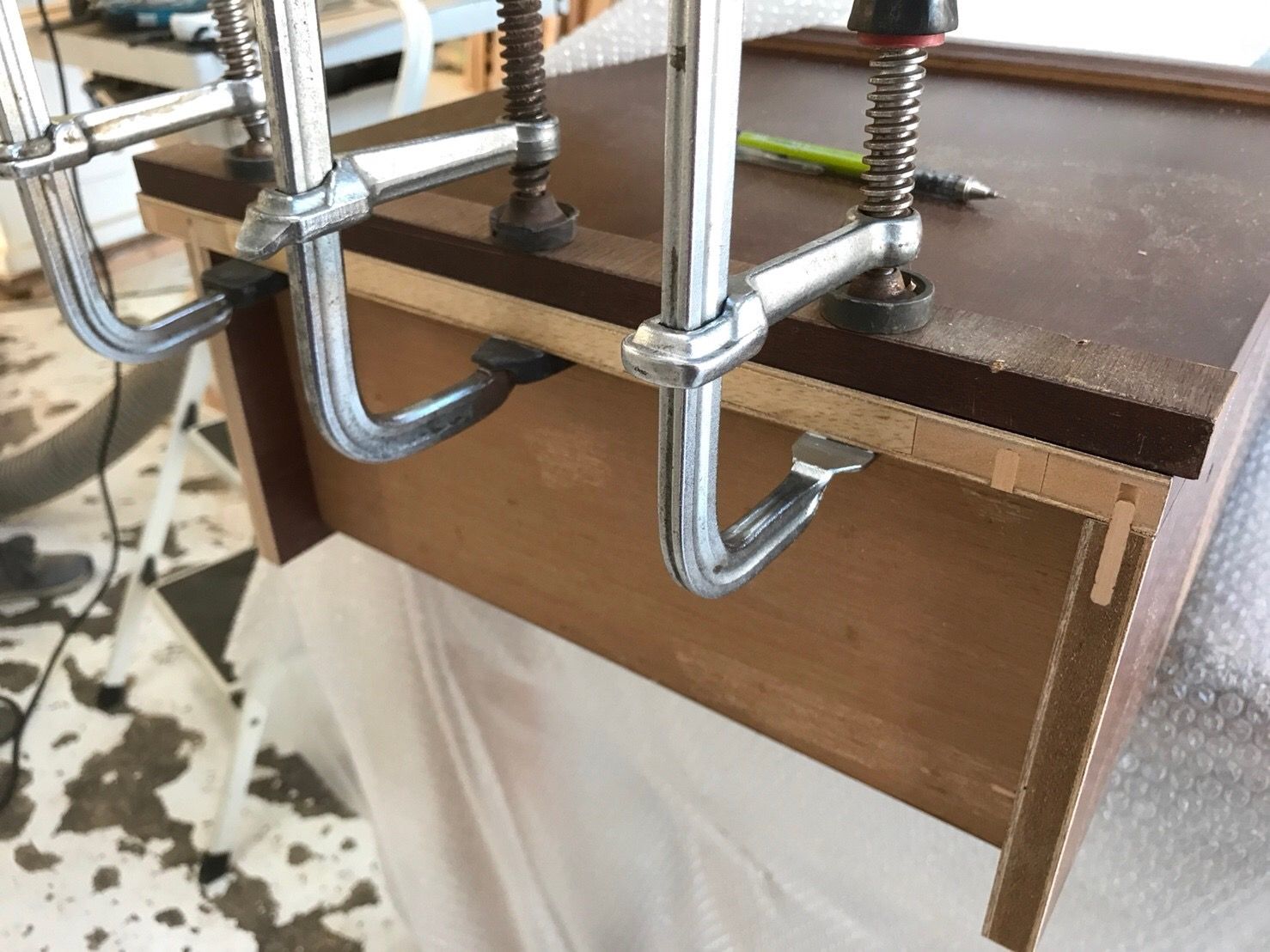 隙間に合う厚さの板をいれて、クランプという工具で圧着しました。